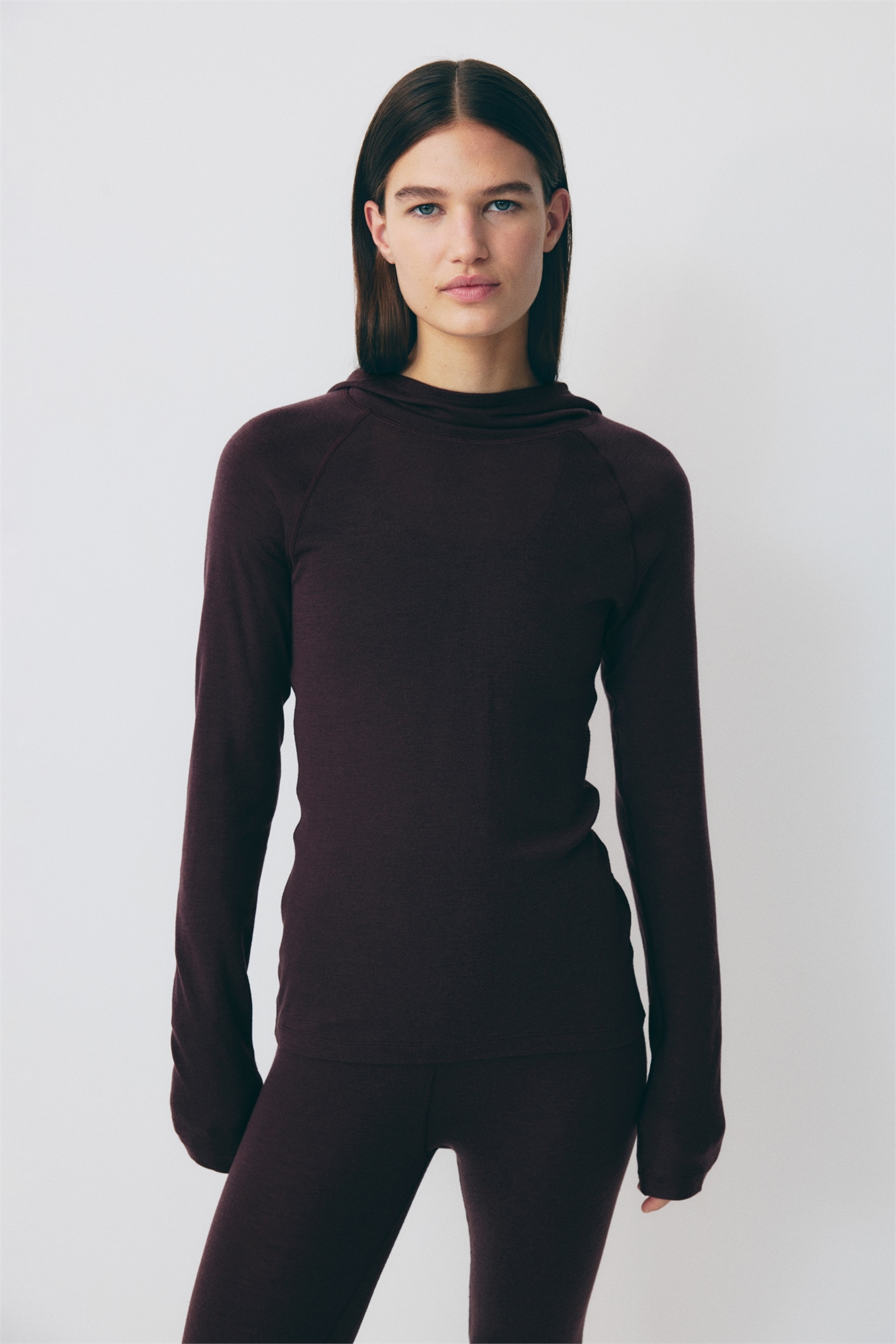 Спортивный топ из согревающего шерстяного джерси. Облегающий крой с капюшоном, длинные рукава реглан и швы flatlock для дополнительного комфорта.