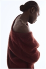 Джемпер большого размера из мягкого трикотажа с содержанием мохера и шерсти. Глубокий V-образный вырез, спущенные плечи и длинные рукава. Узкая тесьма вокруг выреза, на манжетах и подоле.