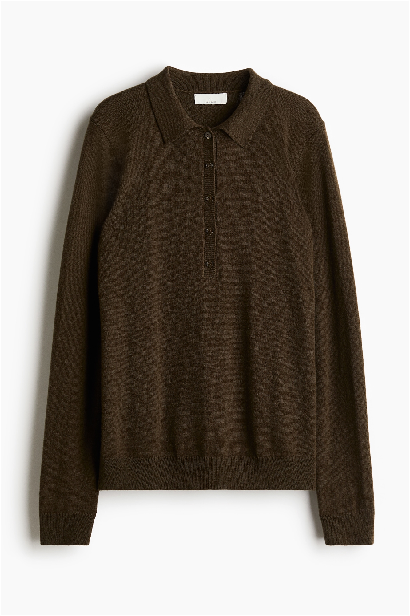 Рубашка-поло из мягкого тонкого трикотажа из смеси шерсти. Воротник, застежка на пуговицах, длинные рукава, манжеты и подол в рубчик.