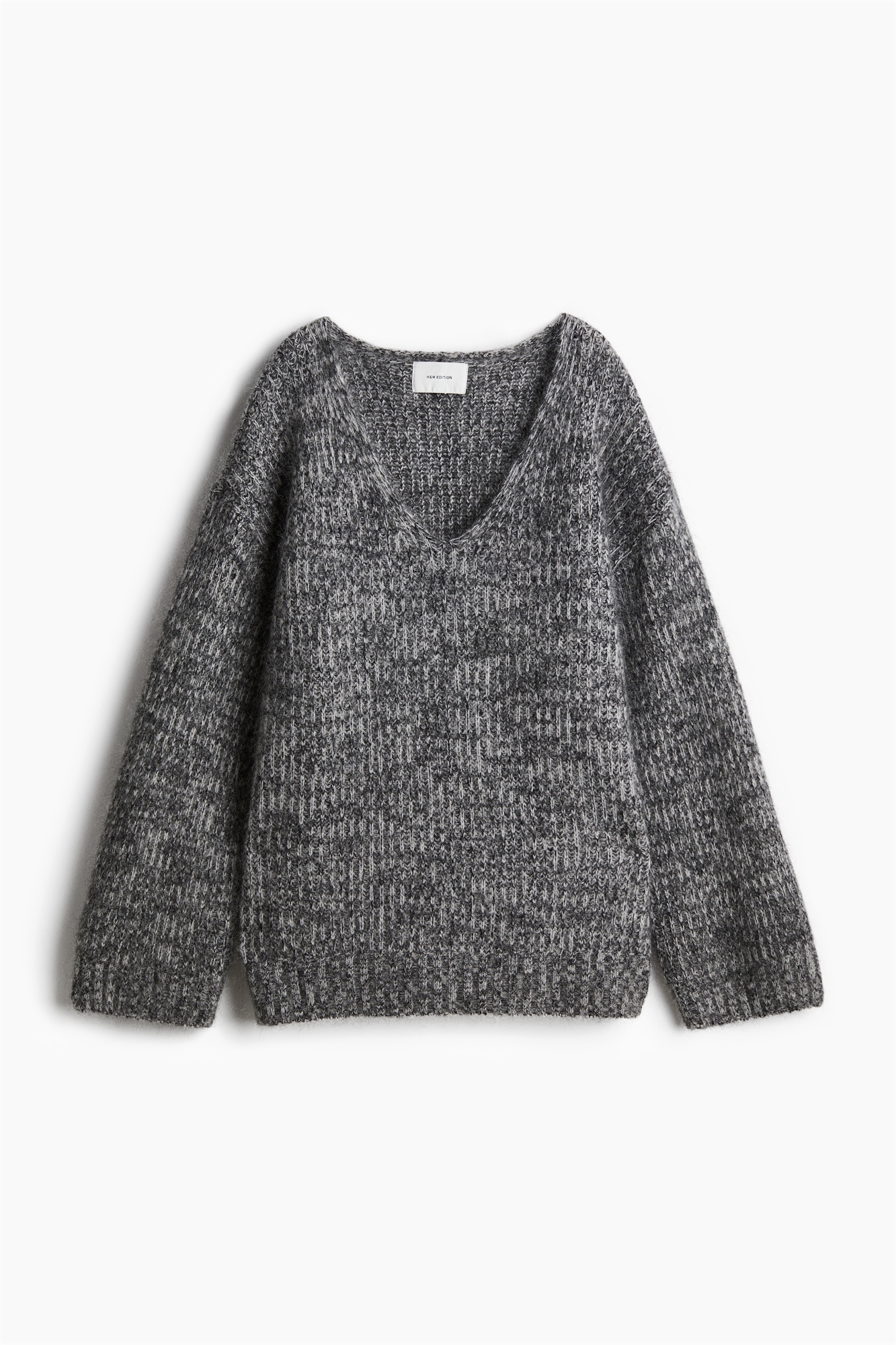Джемпер большого размера из мягкого трикотажа в рубчик с содержанием мохера и шерсти. Глубокий V-образный вырез, спущенные плечи и длинные рукава. Ребристые манжеты и подол.