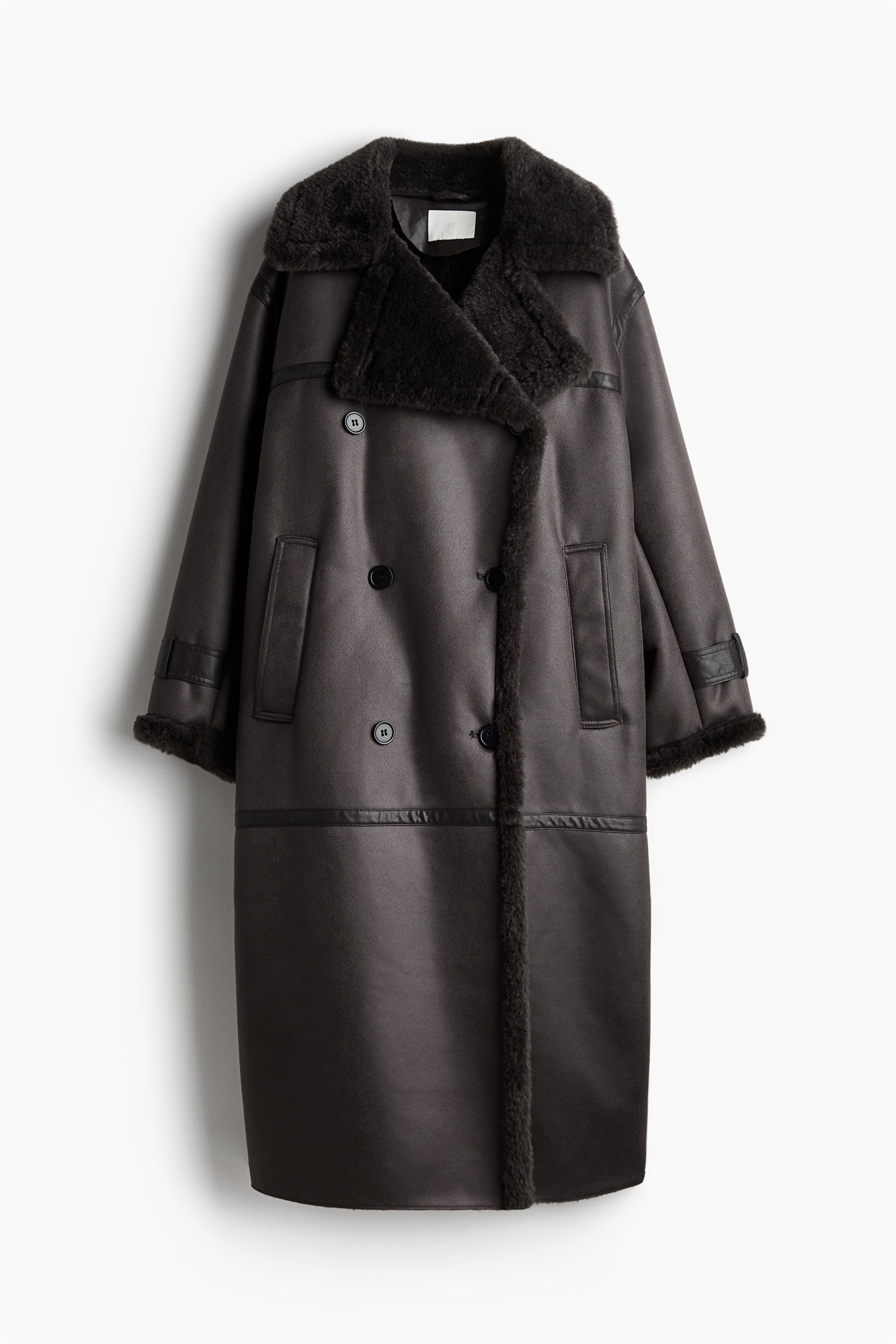 Двубортное пальто длиной до колен из ткани с покрытием и мягкой пушистой подкладкой. Покрой оверсайз с лацканами с вырезом, пуговицами спереди и спущенными плечами. Манжеты на пуговицах и втачные боковые карманы. Одиночная вентиляция на спине.