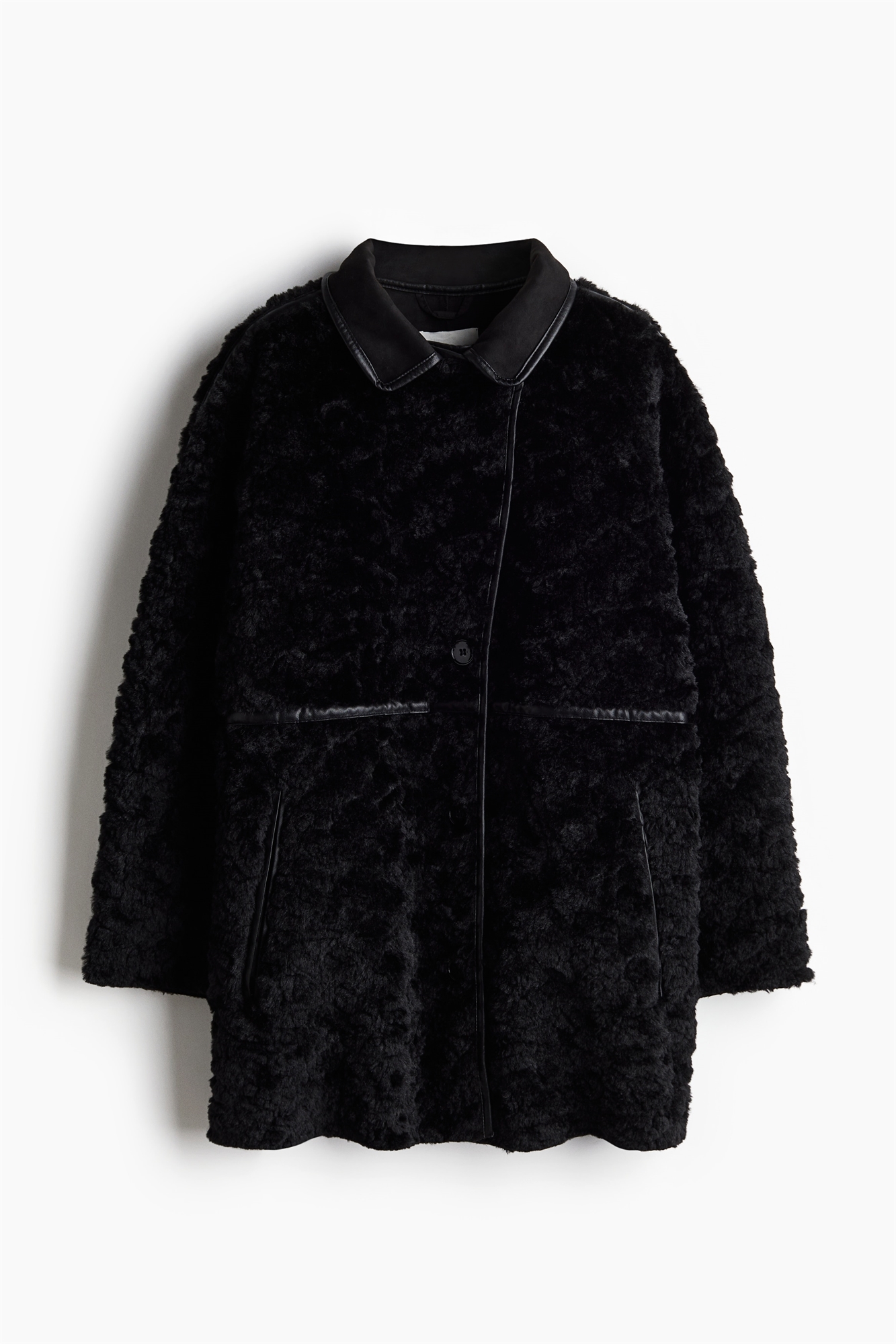 Короткое пальто свободного кроя из пушистой ткани с воротником и отделкой из мелованной ткани. Пуговицы спереди, длинные рукава реглан и втачные боковые карманы.