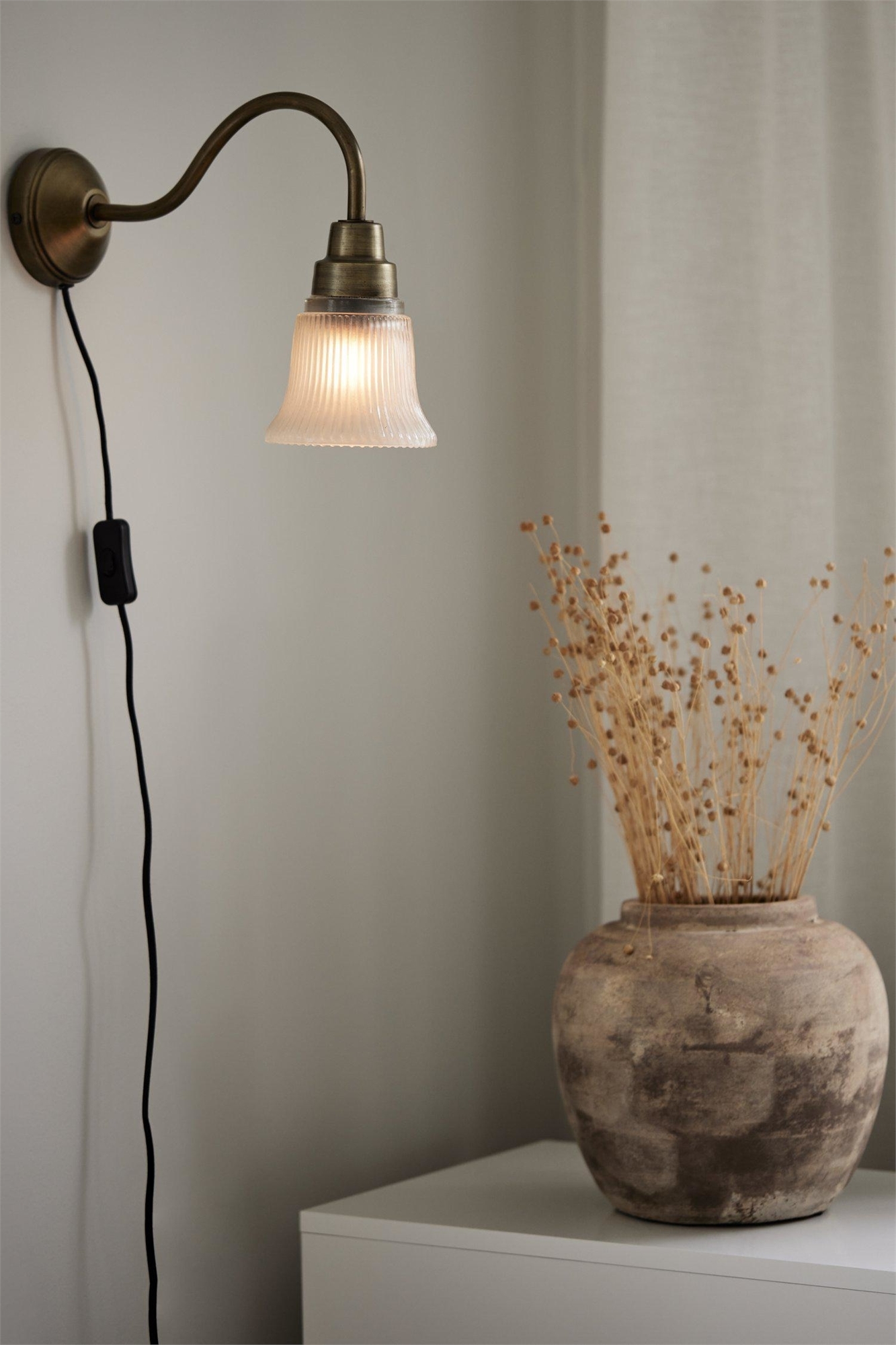Настенный светильник Emmi из железа и стекла, с колоколообразным ребристым стеклом и латунным кронштейном в форме лебединой шеи. Красивый настенный светильник в классическом винтажном стиле. Рифленое стекло и матовая внутренняя поверхность обеспечивают теплый свет. Черный текстильный кабель длиной 2 м с выключателем и плоской вилкой ЕС. Расстояние от стены 34 см. Диаметр стеклянного абажура 12 см. Диаметр настенной тарелки 10 см. Патрон E27, макс. 25 Вт (рекомендуется использовать прозрачную светодиодную лампу в форме мяча для гольфа, чтобы усилить свет). IP20. Лампочка в комплект не входит.
