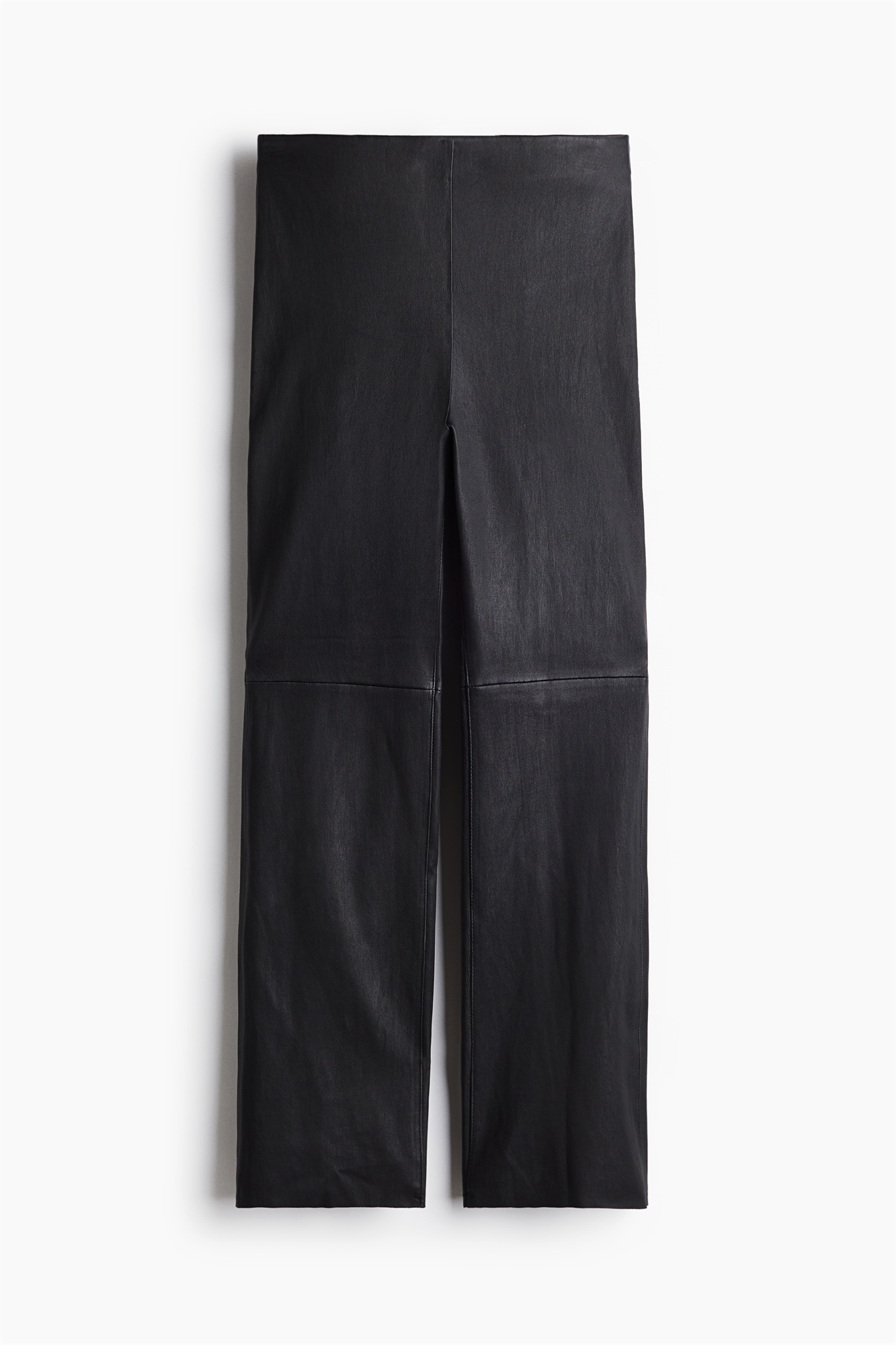 Облегающие брюки из мягкой кожи со скрытой эластичной резинкой на талии и потайной застежкой на молнию и пуговицу с одной стороны. Прямые, длиной до щиколоток, со швом над коленями и необработанными краями.