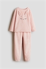 Пижама из мягкого ворса с вышитыми деталями и аппликациями спереди. Верхняя часть с круглым вырезом и длинными рукавами с эластичными манжетами. Низ с эластичным поясом и тесемками по краям.