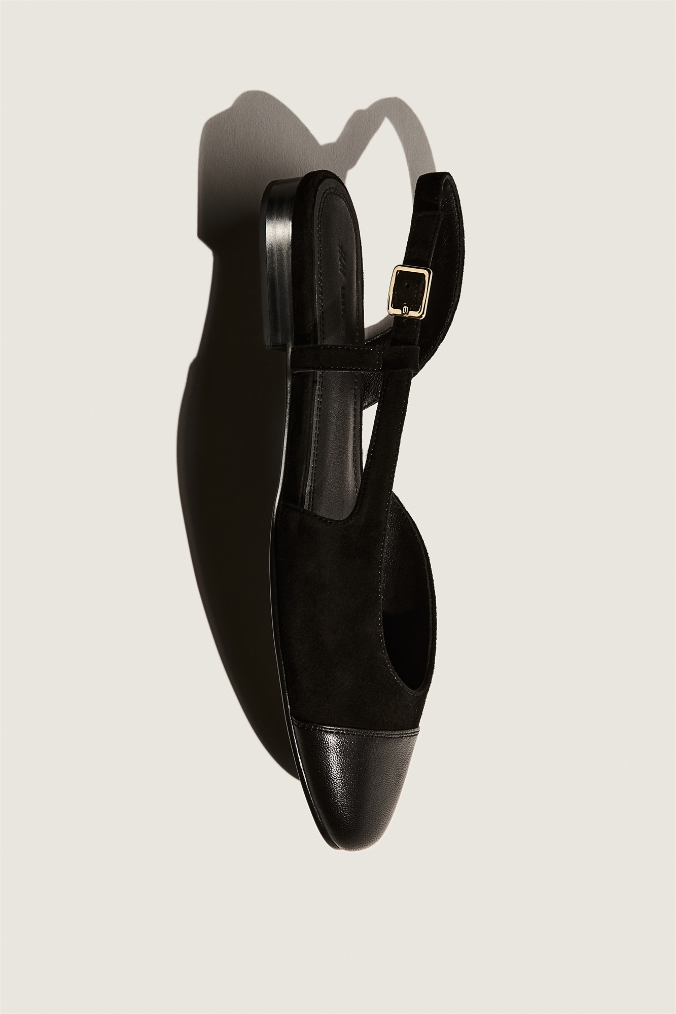 Балетки из мягкой замши с разрезом из кожи спереди. Закругленные мыски и узкий регулируемый ремешок на каблуке с металлической пряжкой. Кожаные подкладка и стелька.