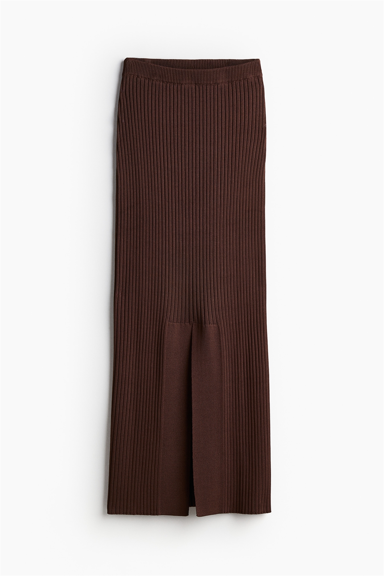 Длинная приталенная юбка из плотного трикотажа в рубчик с высокой эластичной талией и прямым подолом, украшенным панелью из тонкой вязки с разрезом спереди.