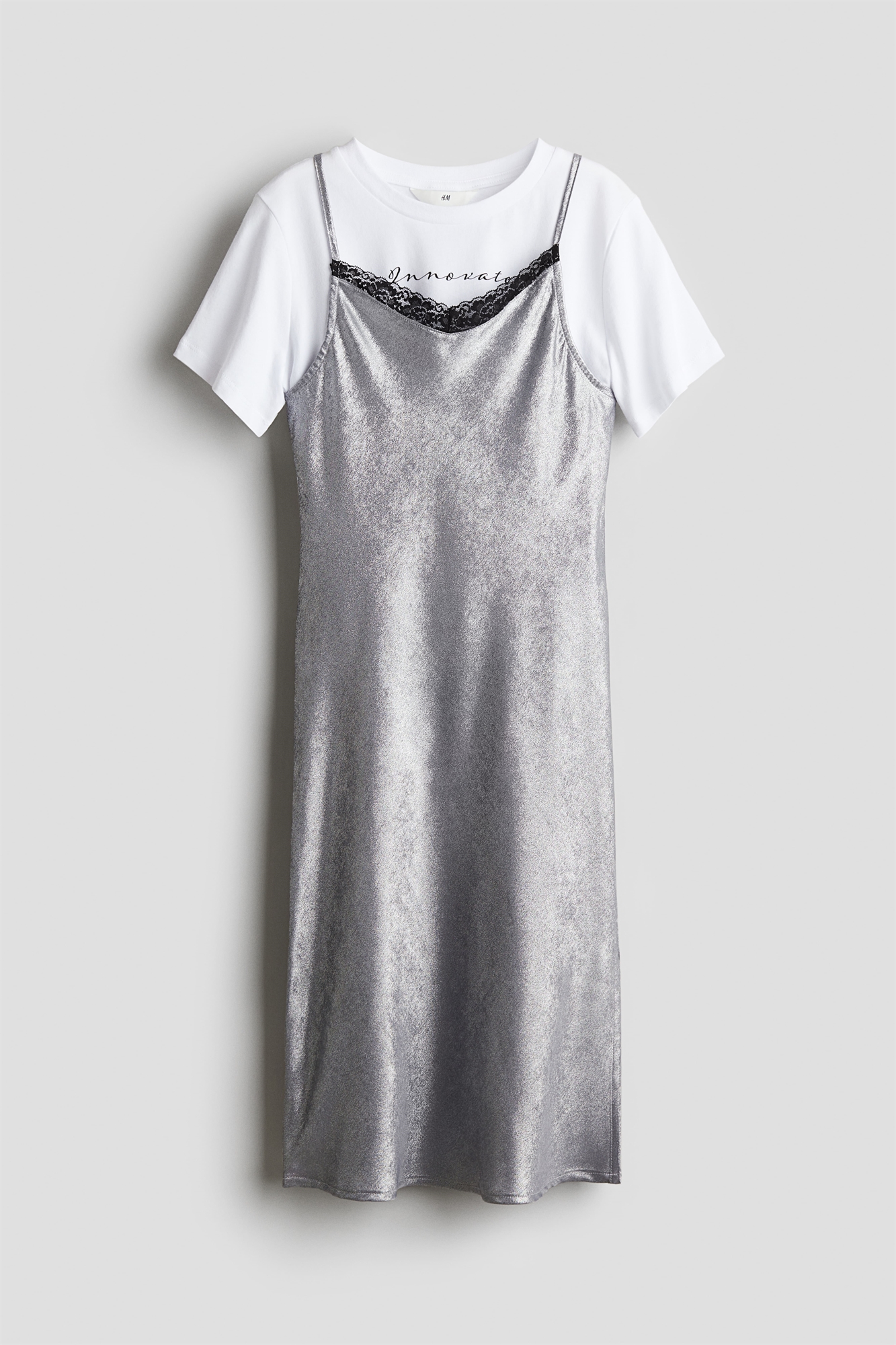 Комплект из топа и платья-слипа. Топ из мягкого хлопкового джерси с круглым вырезом с ребристой отделкой и короткими рукавами. Платье из атласа с бретельками-спагетти и V-образным вырезом с кружевной отделкой.