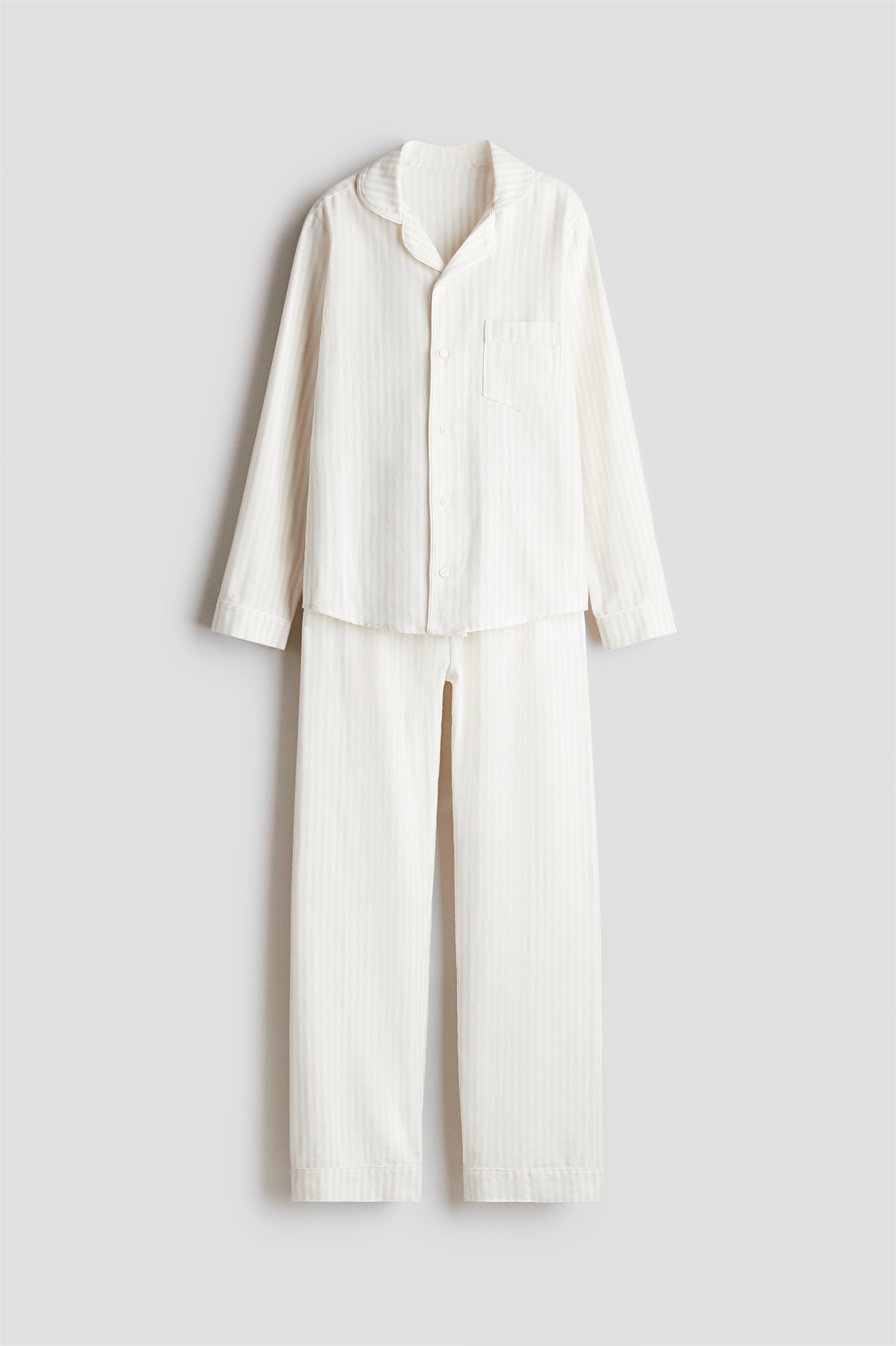 Пижама с рубашкой и нижней частью из хлопковой фланели. Рубашка с отложным воротником, пуговицами спереди, накладным нагрудным карманом и длинными рукавами с отворотами на манжетах. Низ с эластичной талией.