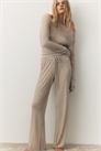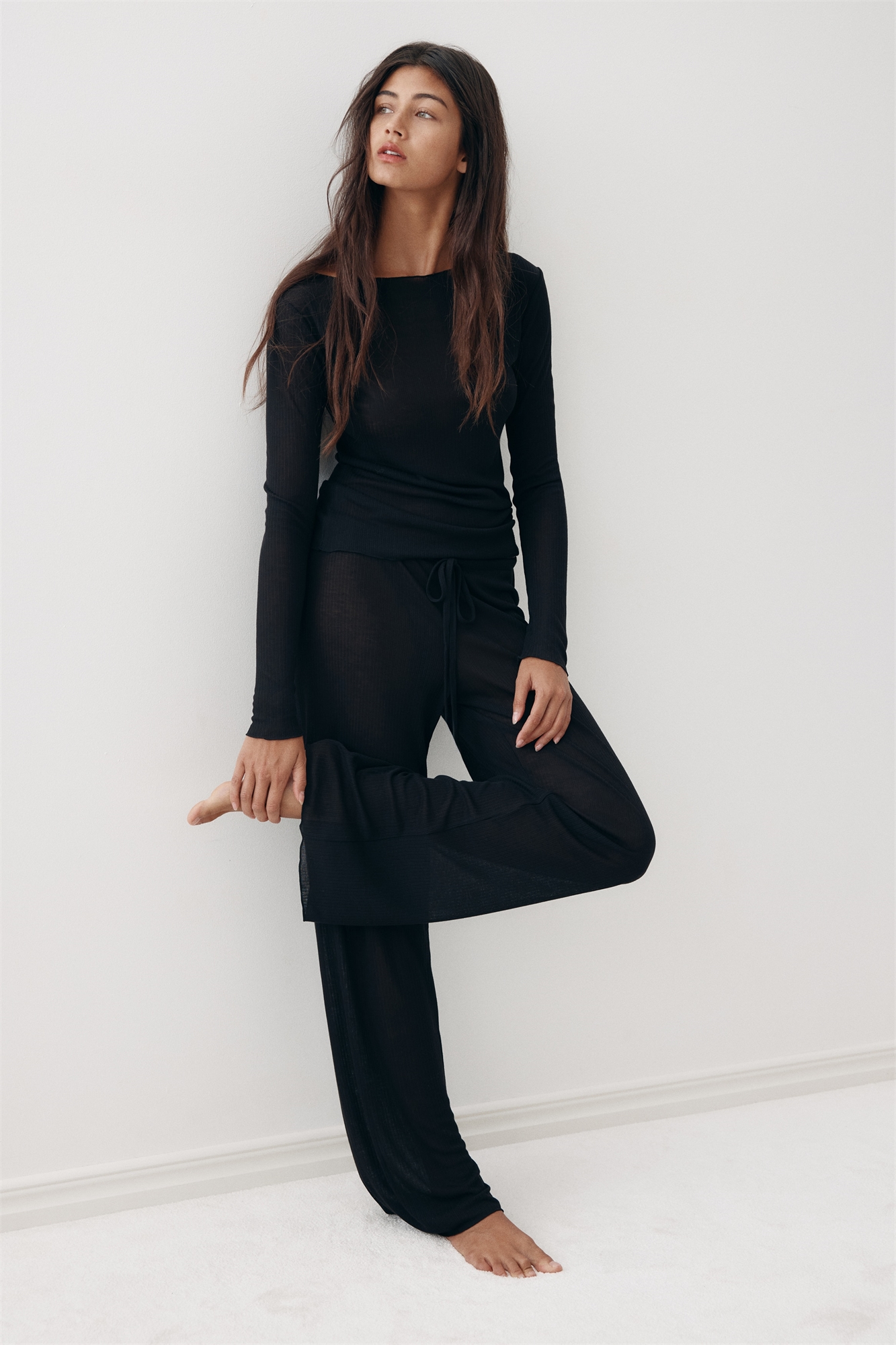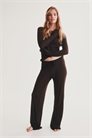 Пижама с топом и брюками из тонкого ребристого трикотажа с оверлочными краями. Облегающий топ с вырезом-лодочкой и длинными рукавами. Прилегающие брюки с эластичным поясом и широкими штанинами.