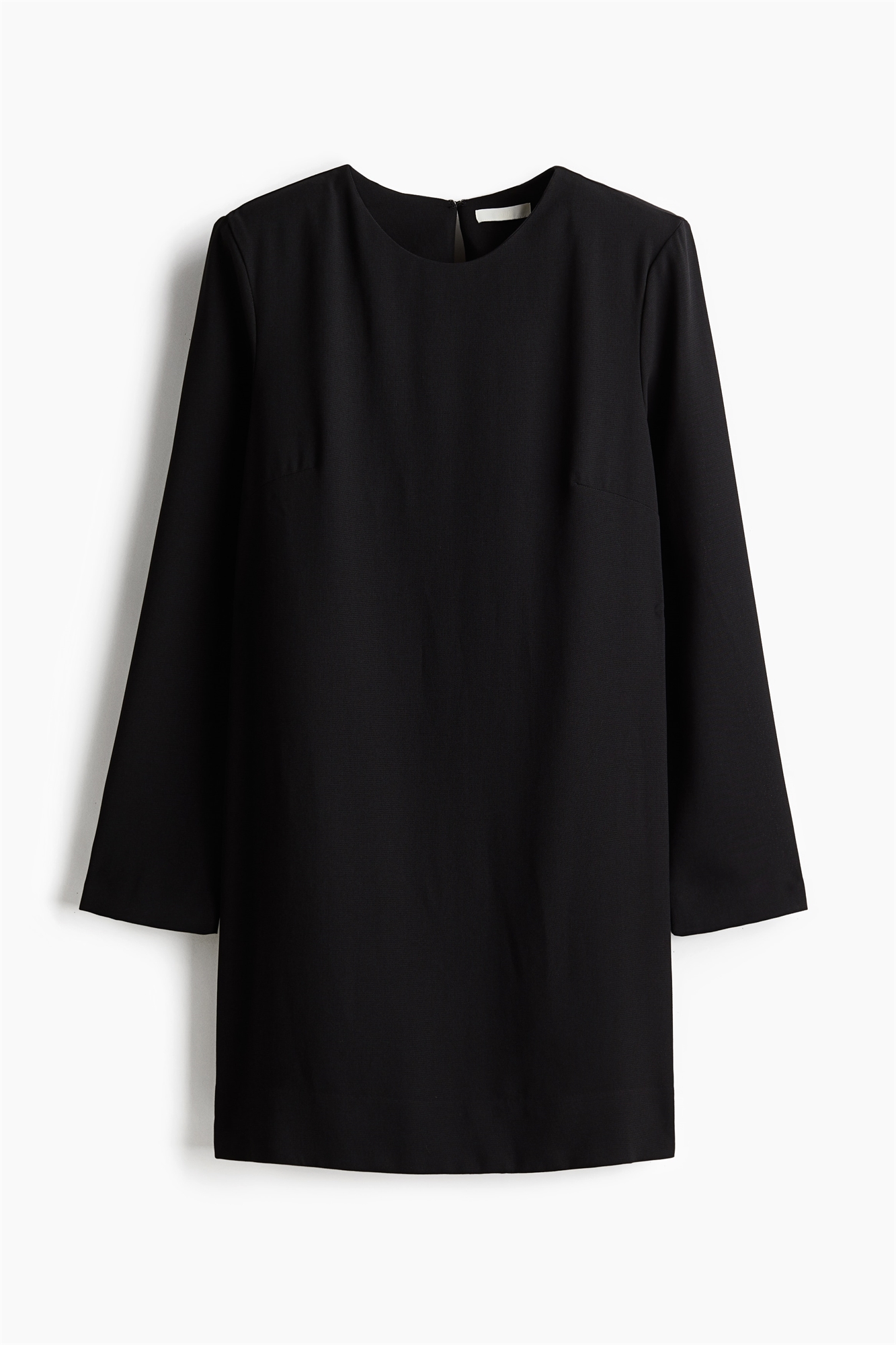 Короткое платье из тканого материала с круглым вырезом, потайной застежкой-крючком сзади на шее, подплечниками и длинными рукавами. Без подкладки.