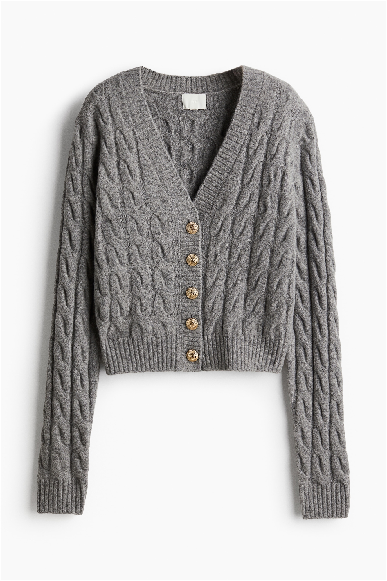 Короткий кардиган из мягкого трикотажа с добавлением шерсти. V-образный вырез, металлические пуговицы золотистого цвета спереди, слегка спущенные плечи и длинные рукава. Окантовка вокруг выреза, по краю пуговиц, на манжетах и подоле.