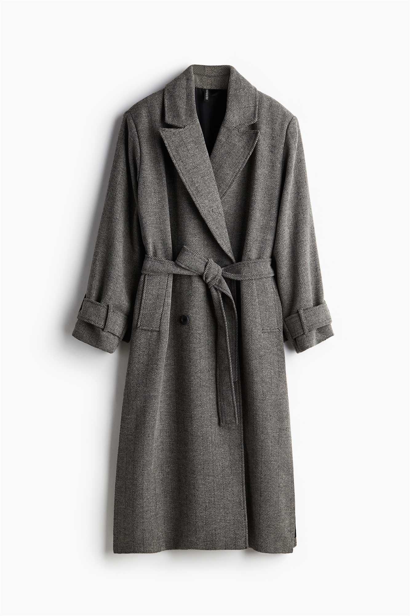 Двубортное пальто длиной до колен из тканого материала. Свободный крой с пикообразными лацканами, пуговицами спереди и широким съемным поясом-завязкой на талии. Манжеты на пуговицах, втачные передние карманы и высокий разрез по бокам подола. На подкладке.