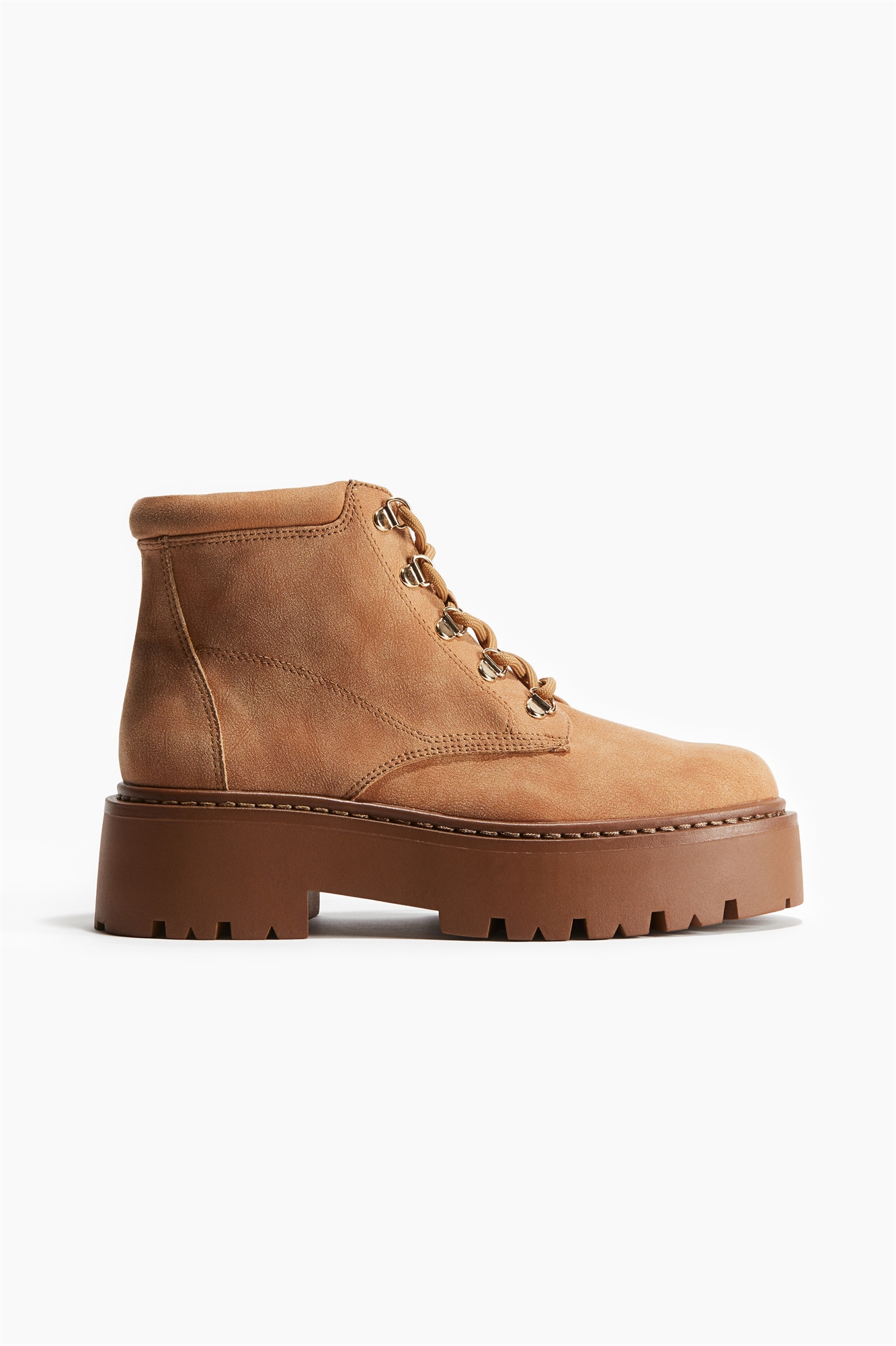 Ботинки по щиколотку из ворсистой ткани с мягкой подкладкой, шнуровкой спереди и толстой подошвой с узором внизу. Атласные подкладка и стелька.