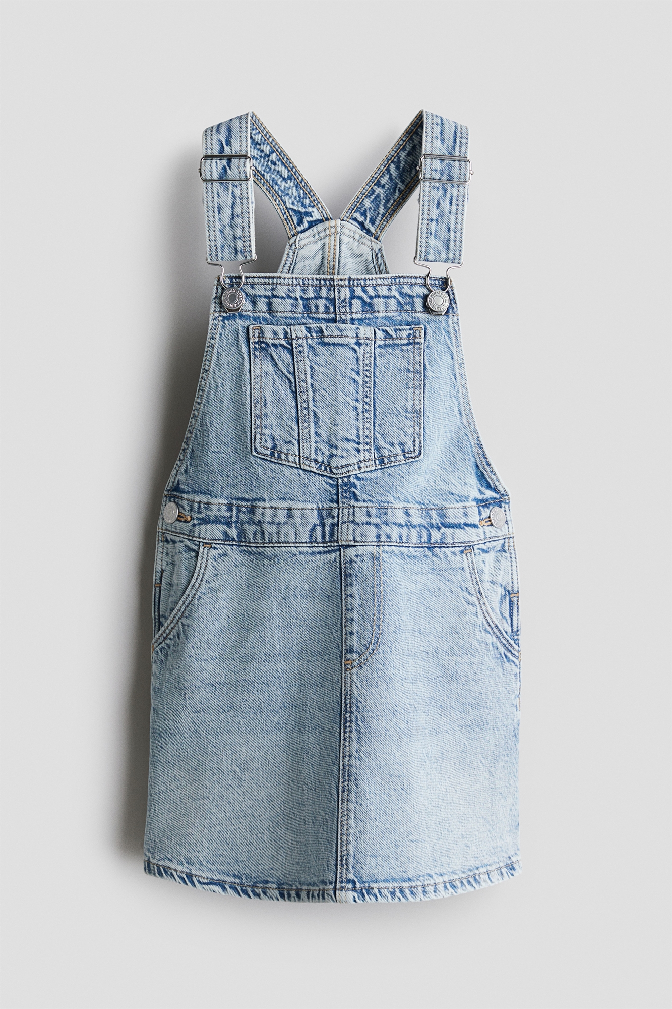 Платье-туника из хлопкового денима. Регулируемые бретели с металлическими застежками, нагрудный карман, передние и задние карманы. Застежки по бокам и фальшивая ширинка.