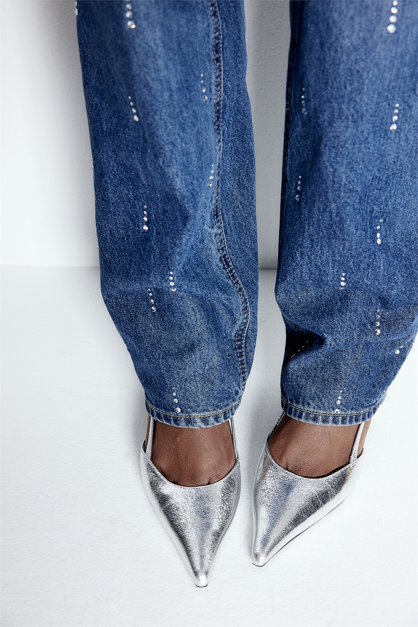 Придворные туфли из лакированной ткани с заостренным носком, узким закрытым каблуком и узким регулируемым ремешком на каблуке с металлической пряжкой. Каблук 7 см.