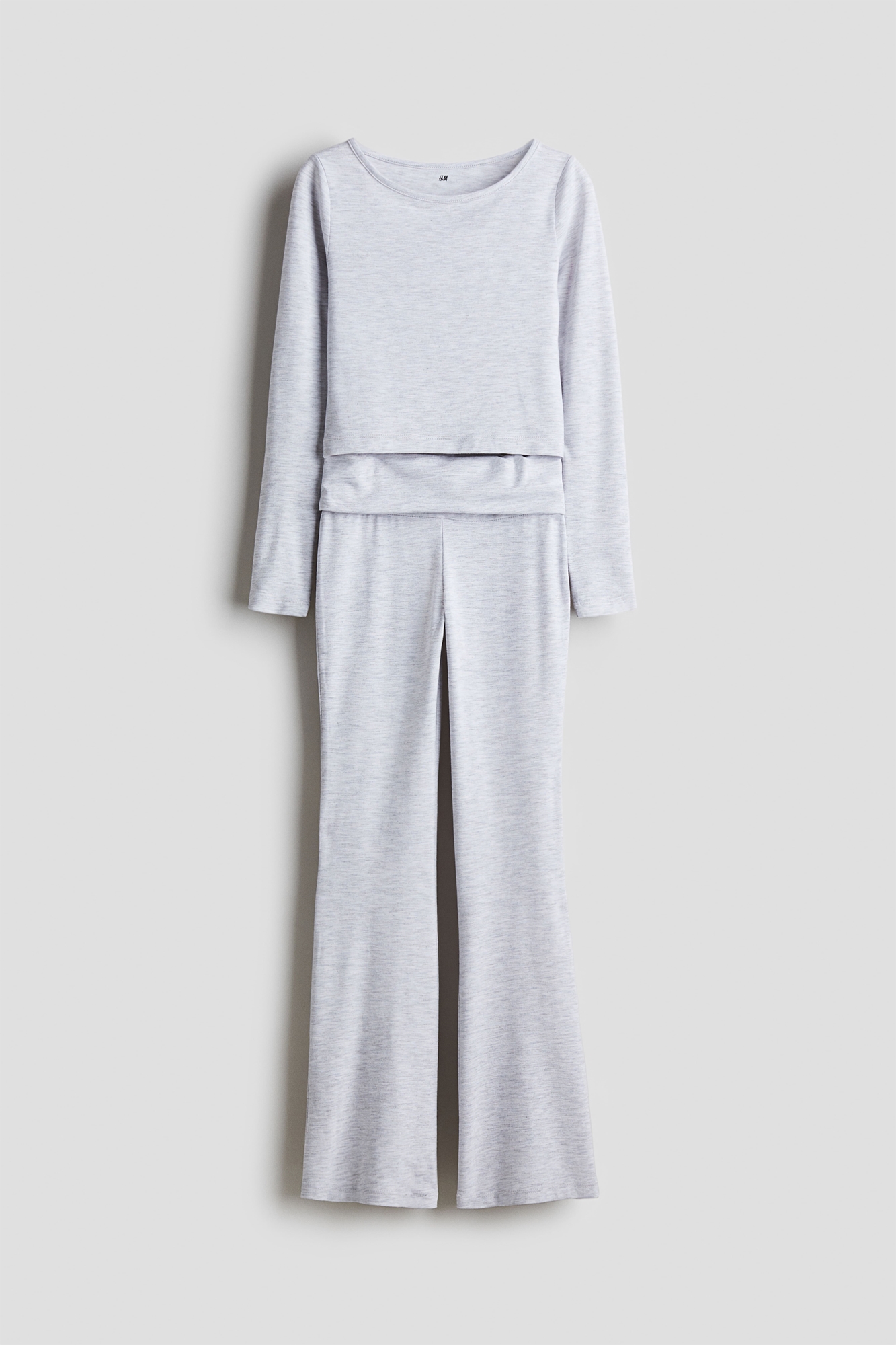 Комплект из мягкого трикотажа, состоящий из топа и брюк в тон. Топ с длинными рукавами, горловиной-лодочкой и прямым покроем. Брюки с отложным поясом и расклешенным подолом.