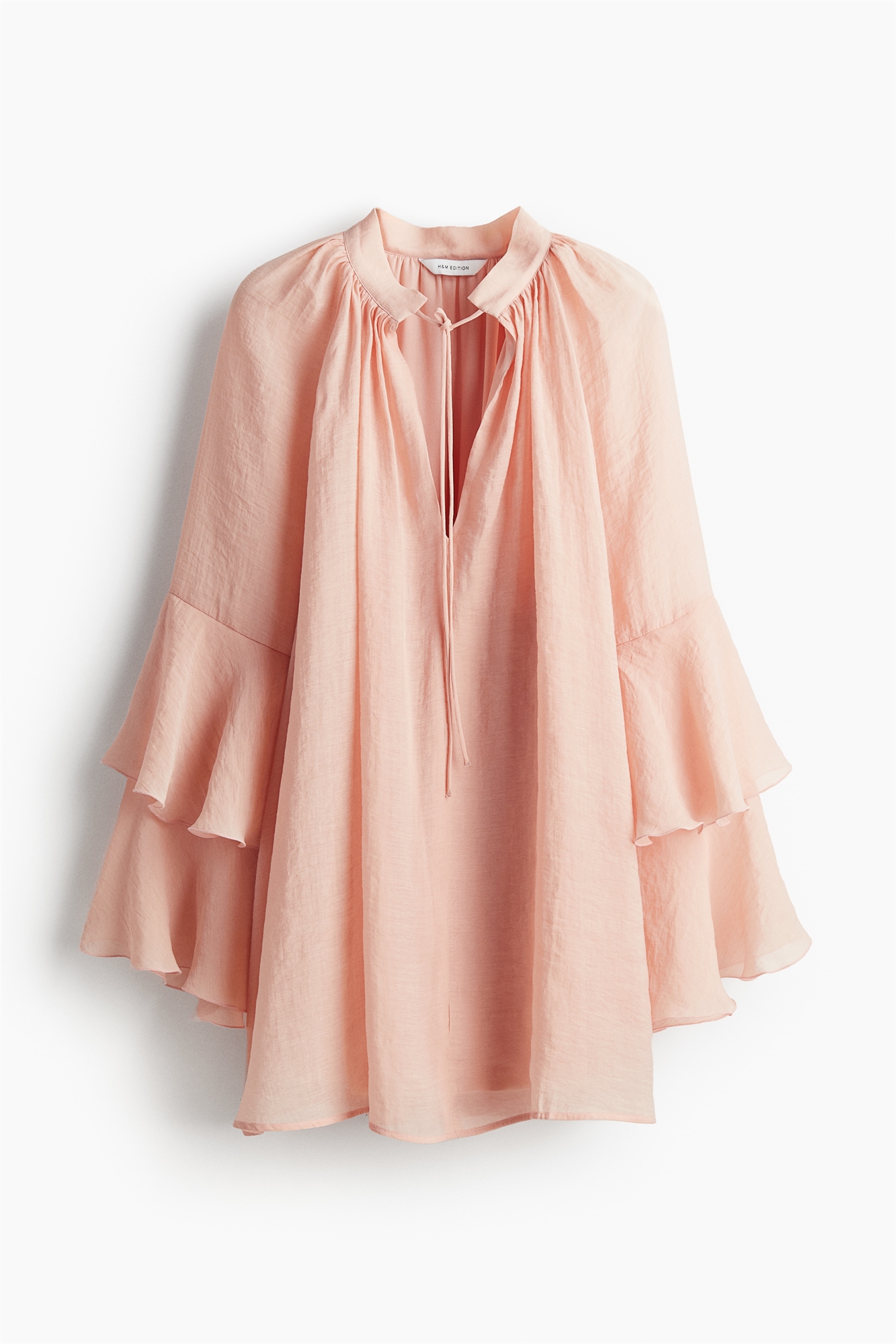 Короткое платье А-линии из полотняного переплетения с воротником-бантом со складками по всему периметру и V-образной проймой с завязками-спагетти спереди. Длинные рукава реглан с воланами. На подкладке.