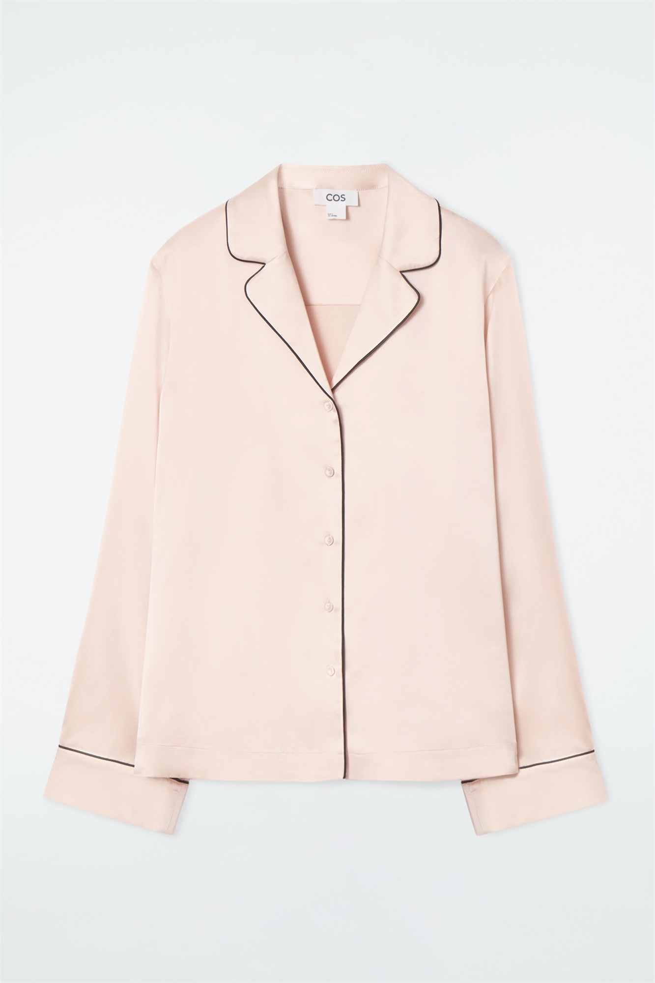 Эта пижамная рубашка сшита из роскошного мягкого шелка тутового дерева, который располагает к отдыху. Она имеет свободный крой, отложной воротник и угольную отделку, которая мягко контрастирует с нежным абрикосовым оттенком. Носите его как комплект с соответствующими камзолом и брюками. Свободный крой Застежка на пуговицы Материал: 100% шелк Mulberry. Без учета отделки / Машинная стирка Длина по спинке для размера S составляет 65 см / Модель носит размер S