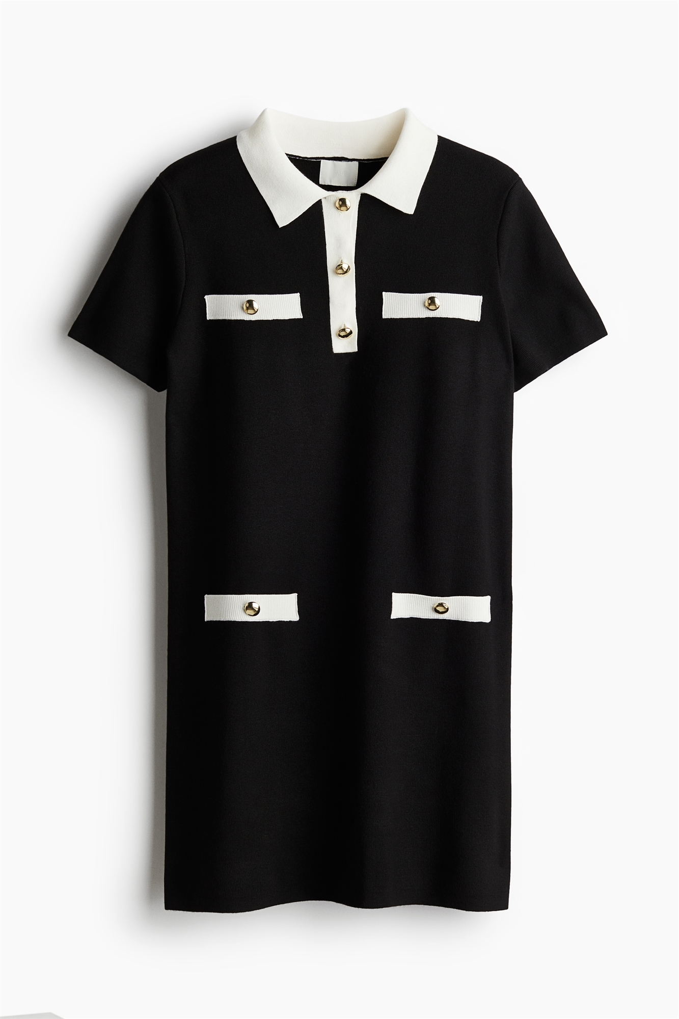 Короткое платье из тонкого трикотажа с воротником, застежкой на пуговицы, короткими рукавами и втачными карманами с пуговицей на груди и спереди.