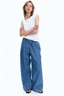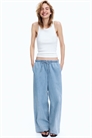 Свободные брюки из мягкого денима с высокой талией, эластичным поясом, узким шнурком и небольшой оборкой. Небрежные боковые карманы и широкие ноги.
