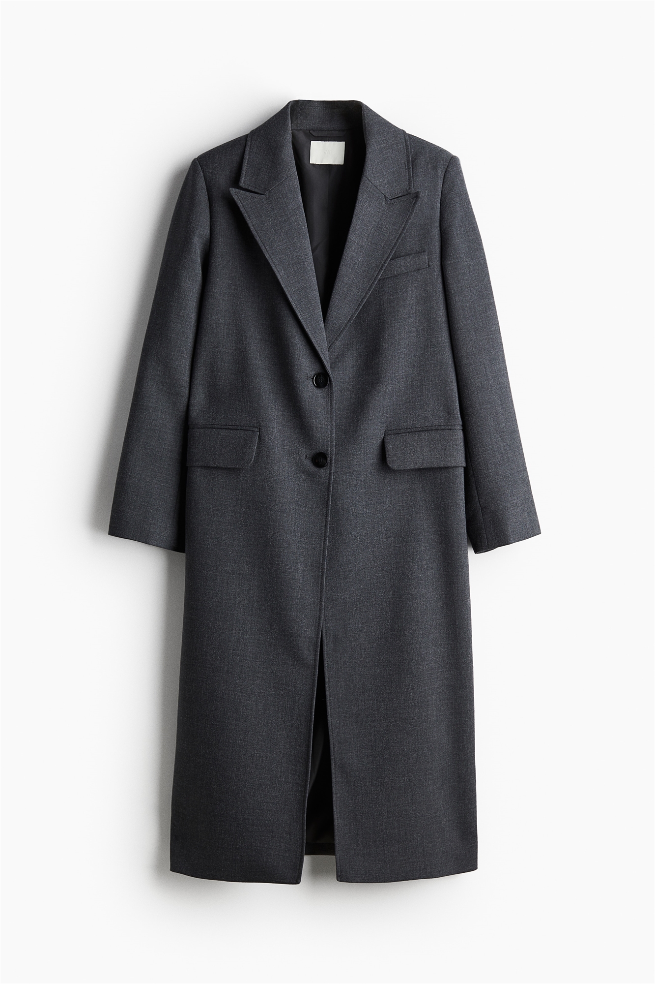 Длинное пальто из тканого материала с пикообразными лацканами и пуговицами спереди. Свободный крой с подплечниками, длинные рукава с манжетами на пуговицах, накладной карман на груди и втачные передние карманы с клапаном. Одинарная вентиляция на спине. На подкладке.