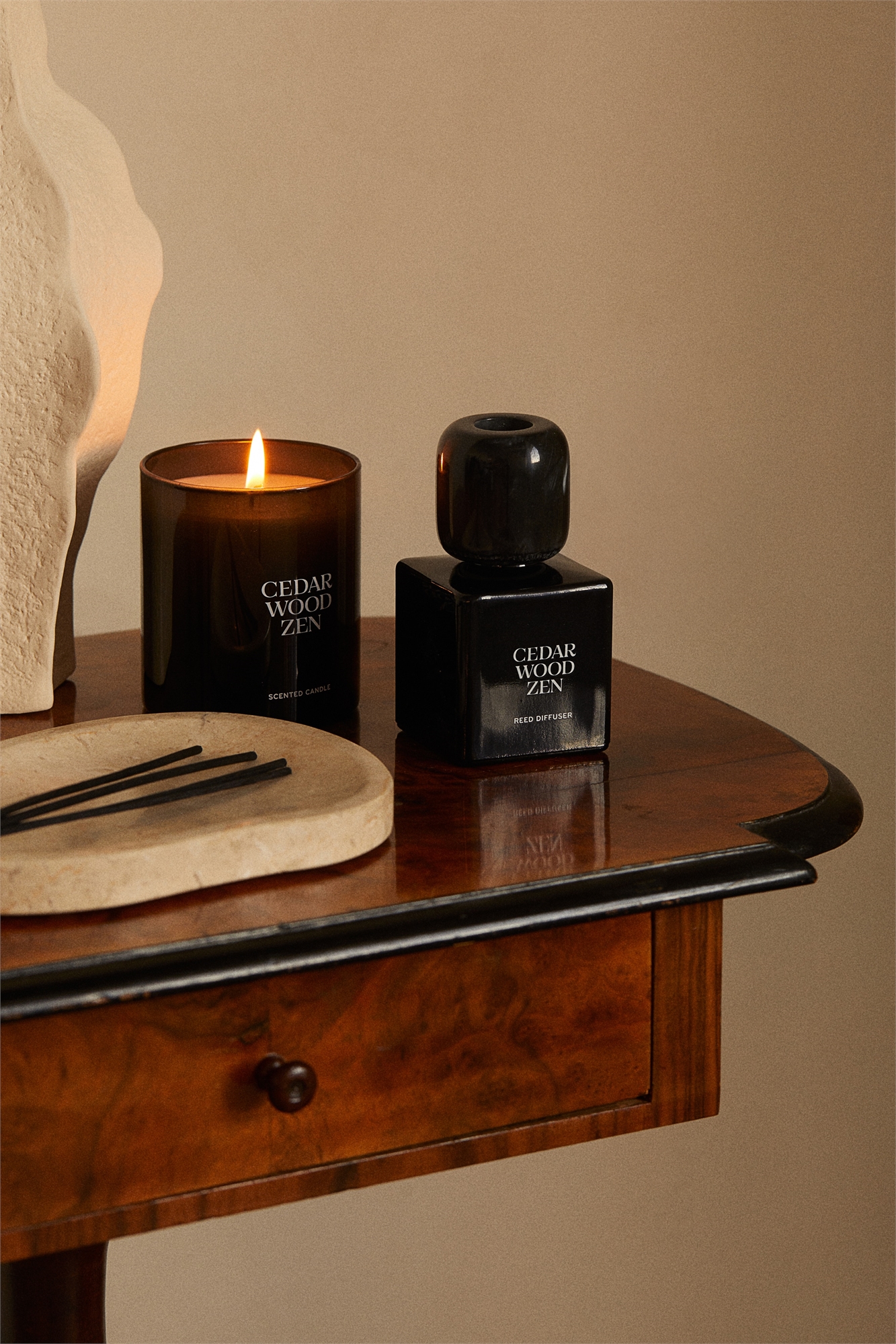 Тростниковый диффузор в кубическом стеклянном контейнере с бамбуковыми тростниками и ароматическим маслом. Элегантная стеклянная пробка с мраморной отделкой. Тростник впитывает масло и распространяет приятный аромат по комнате. Размер контейнера 5,5x5,5x5,5 см. 100 мл.