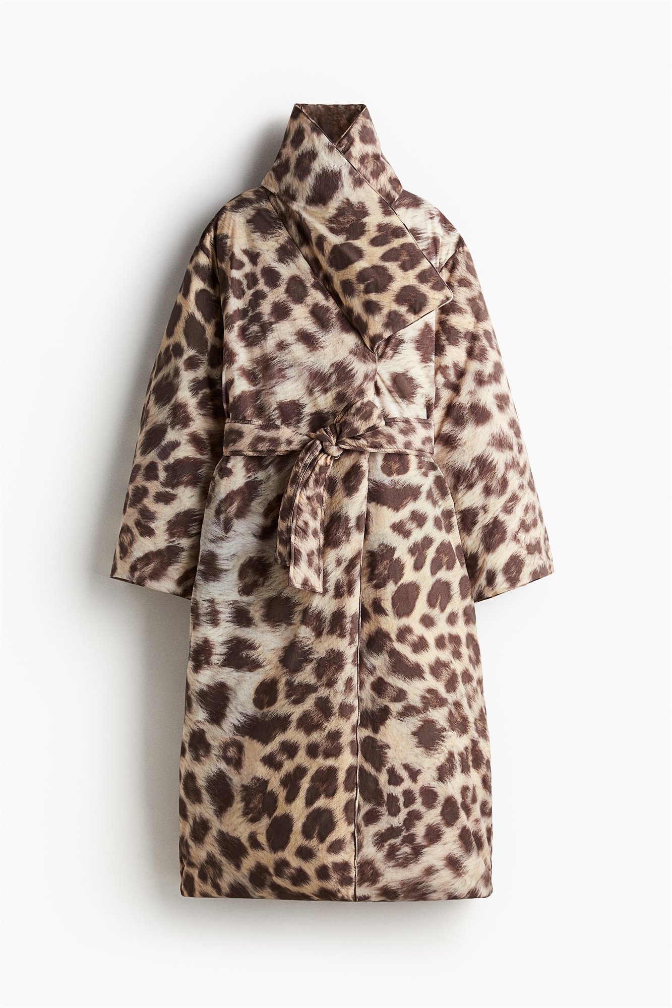 Коллекция Studio. Пуховик длиной до колена из водоотталкивающего функционального нейлона с леопардовым принтом по всей поверхности и соединенными швами в качестве чистого завершающего штриха. Силуэт оверсайз с шалевым воротником с угловым нижним краем. Скрытая магнитная застежка спереди, незаметные боковые карманы и широкий съемный пояс-завязка на талии для создания эффекта приталенности. На подкладке.