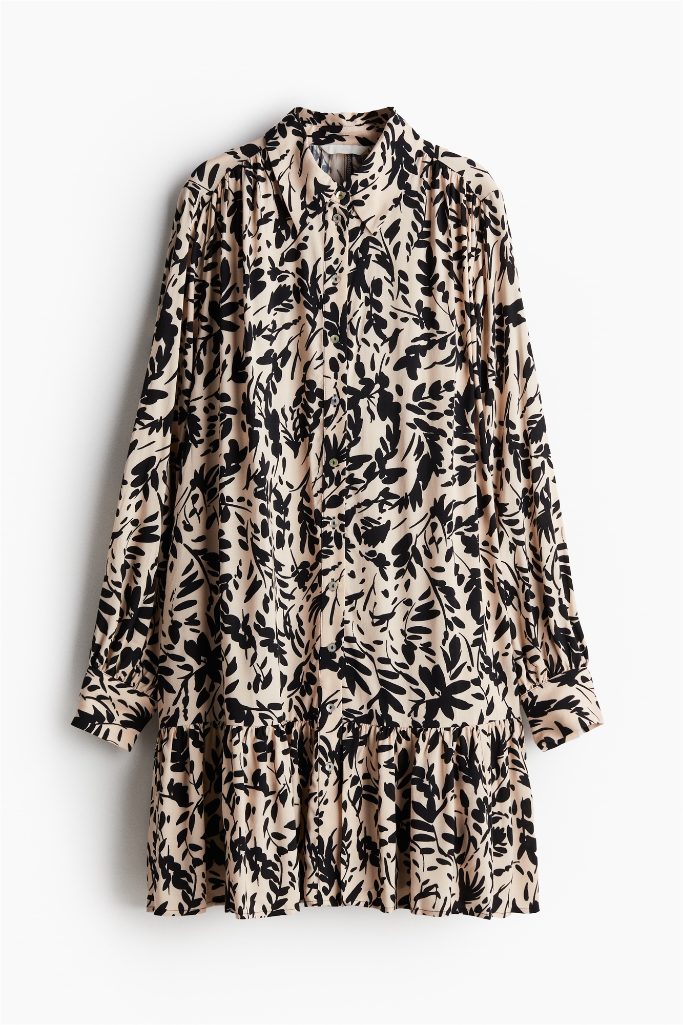 Короткое платье оверсайз из вискозы с воротником и пуговицами спереди. Сборки на плечах и сзади на шее, длинные рукава-баллон и манжеты на пуговицах. Шов над подолом для придания дополнительного объема. Без подкладки.