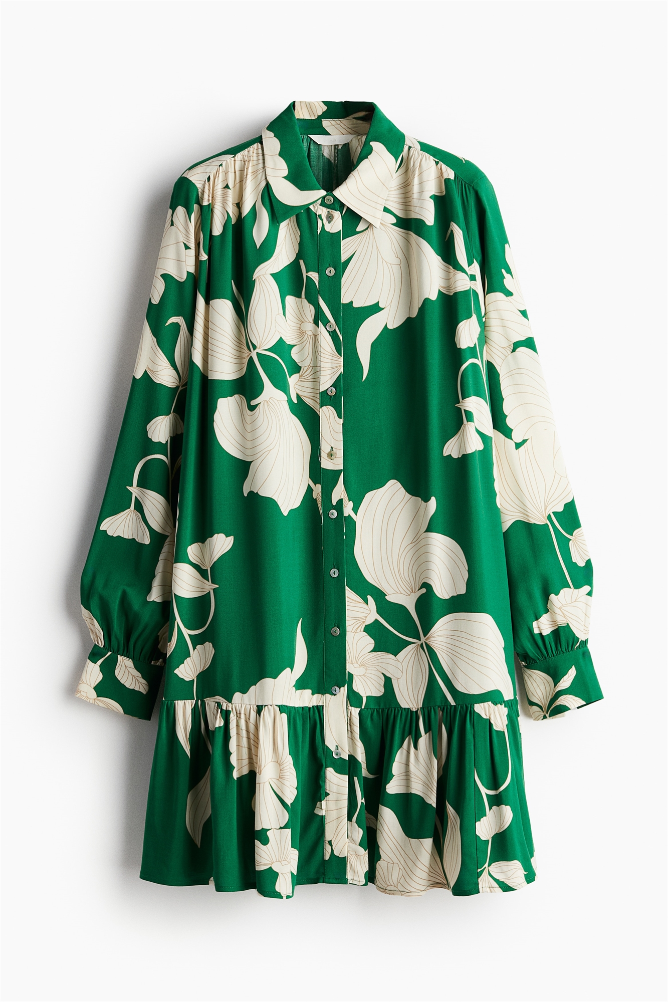 Короткое платье оверсайз из вискозы с воротником и пуговицами спереди. Сборки на плечах и сзади на шее, длинные рукава-баллон и манжеты на пуговицах. Шов над подолом для придания дополнительного объема. Без подкладки.