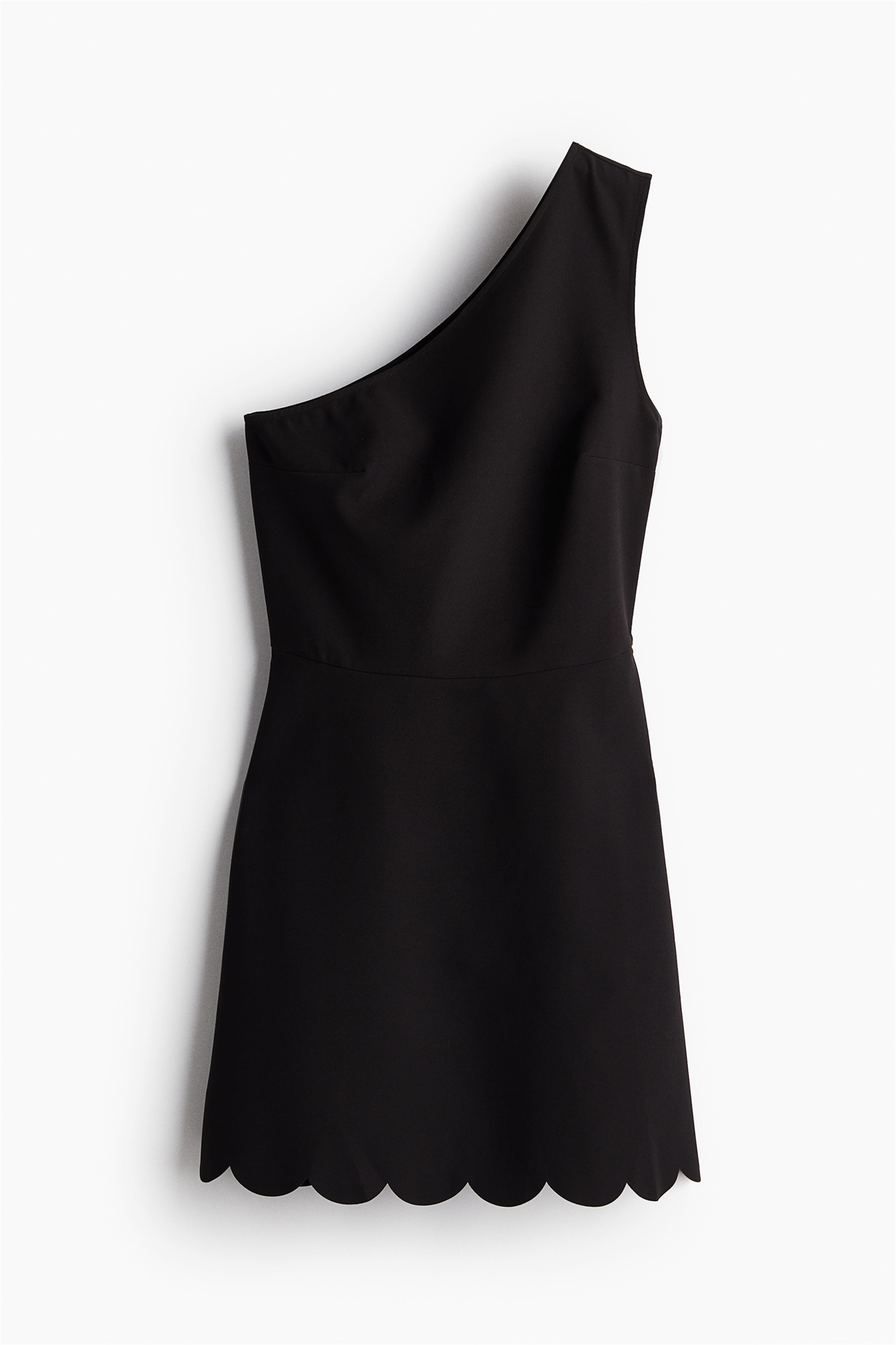 Короткое приталенное платье на одно плечо с асимметричным вырезом, одной широкой бретелью и потайной застежкой на молнию и крючок с глазом с одной стороны. Вытачки на спине, шов на талии и вырезанный лазером гребешковый подол. Без подкладки.