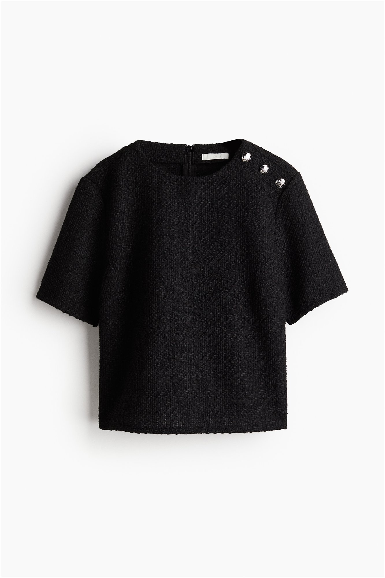 Приталенная блузка из ткани букле с круглым вырезом и декоративной застежкой на пуговицы золотистого цвета на одном плече. Короткие рукава, нагрудные вытачки и потайная застежка-молния сзади.