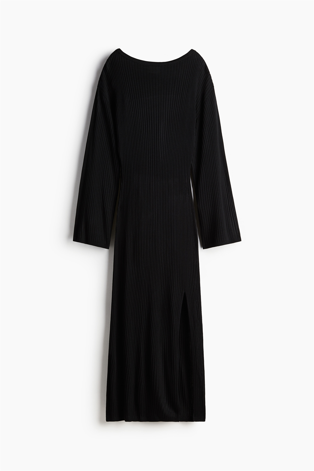 Платье длиной до щиколотки из тонкого трикотажа в рубчик с вырезом-лодочкой и длинными рукавами. Прямой подол с высоким разрезом с одной стороны.