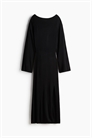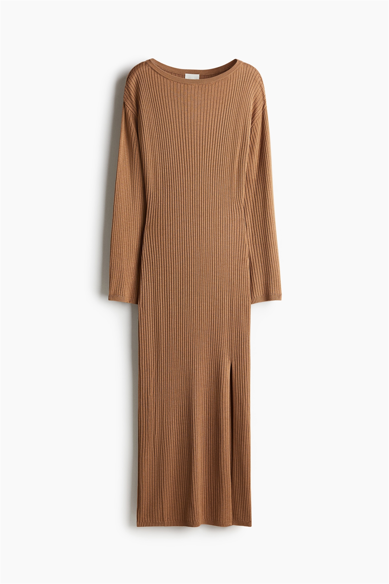 Платье длиной до щиколотки из тонкого трикотажа в рубчик с вырезом-лодочкой и длинными рукавами. Прямой подол с высоким разрезом с одной стороны.