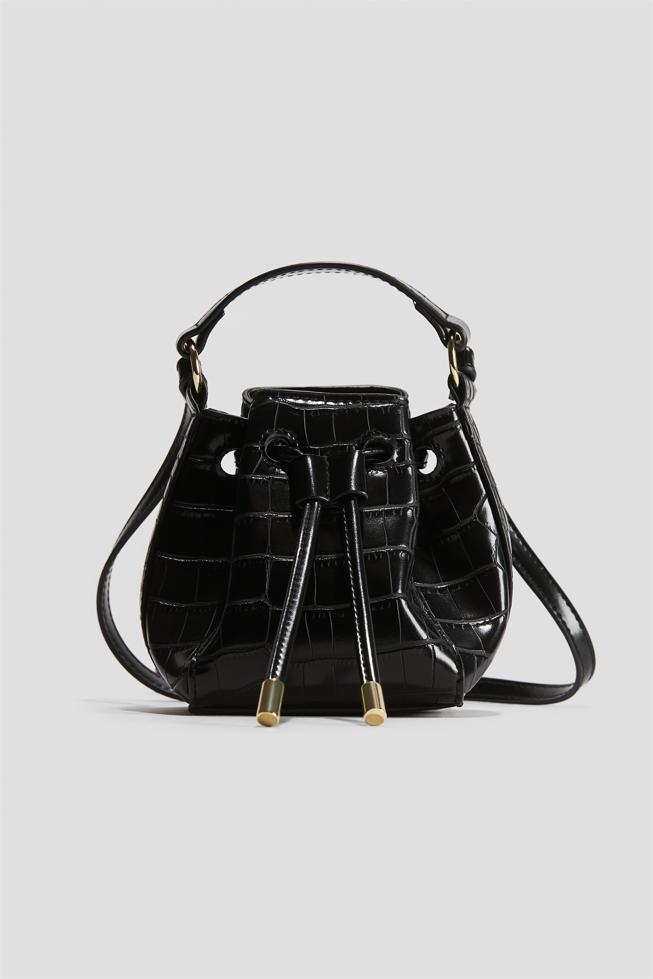 Небольшая сумка-ведро из мелованной ткани с завязкой и ручкой в верхней части. Плечевой ремень с прижимной планкой на каждом конце. Подкладка из тафты. Глубина 7 см. Ширина 10 см. Высота 12 см.