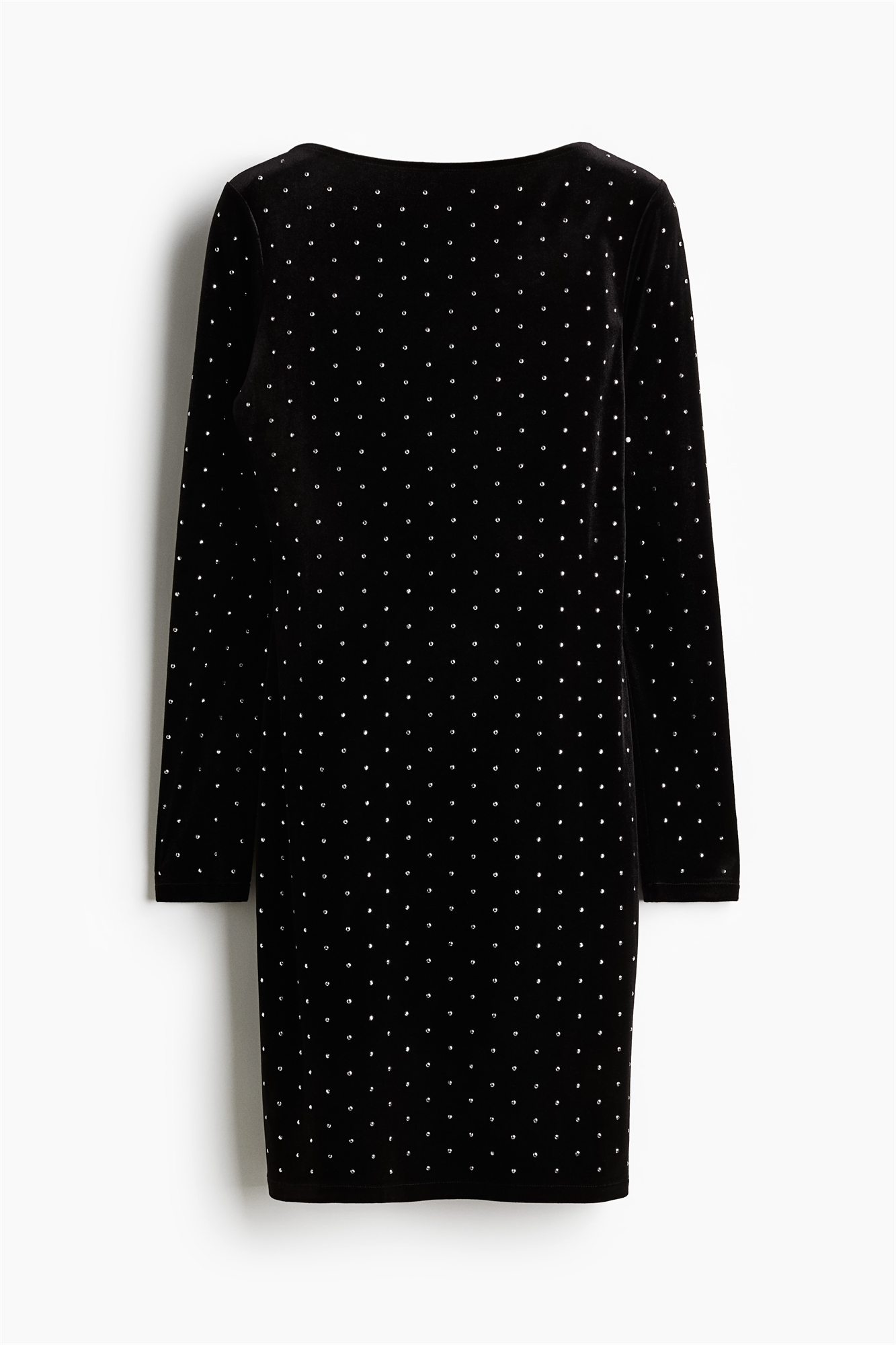 Короткое приталенное платье с вырезом-лодочкой, глубоким круглым вырезом сзади и длинными рукавами.