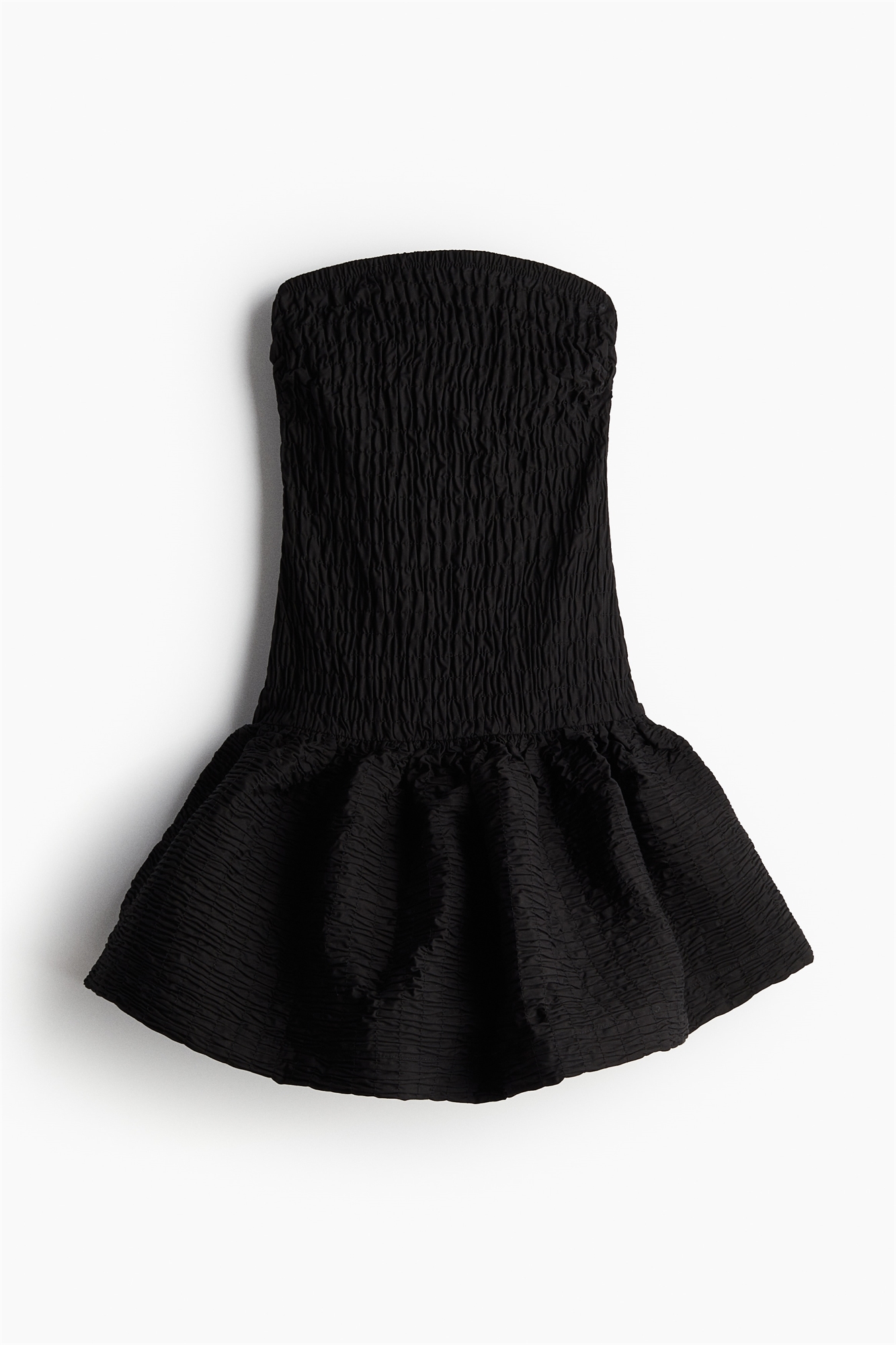 Короткое приталенное платье-бандо из хлопкового поплина с резинкой в верхней части и расклешенной юбкой. Без подкладки.