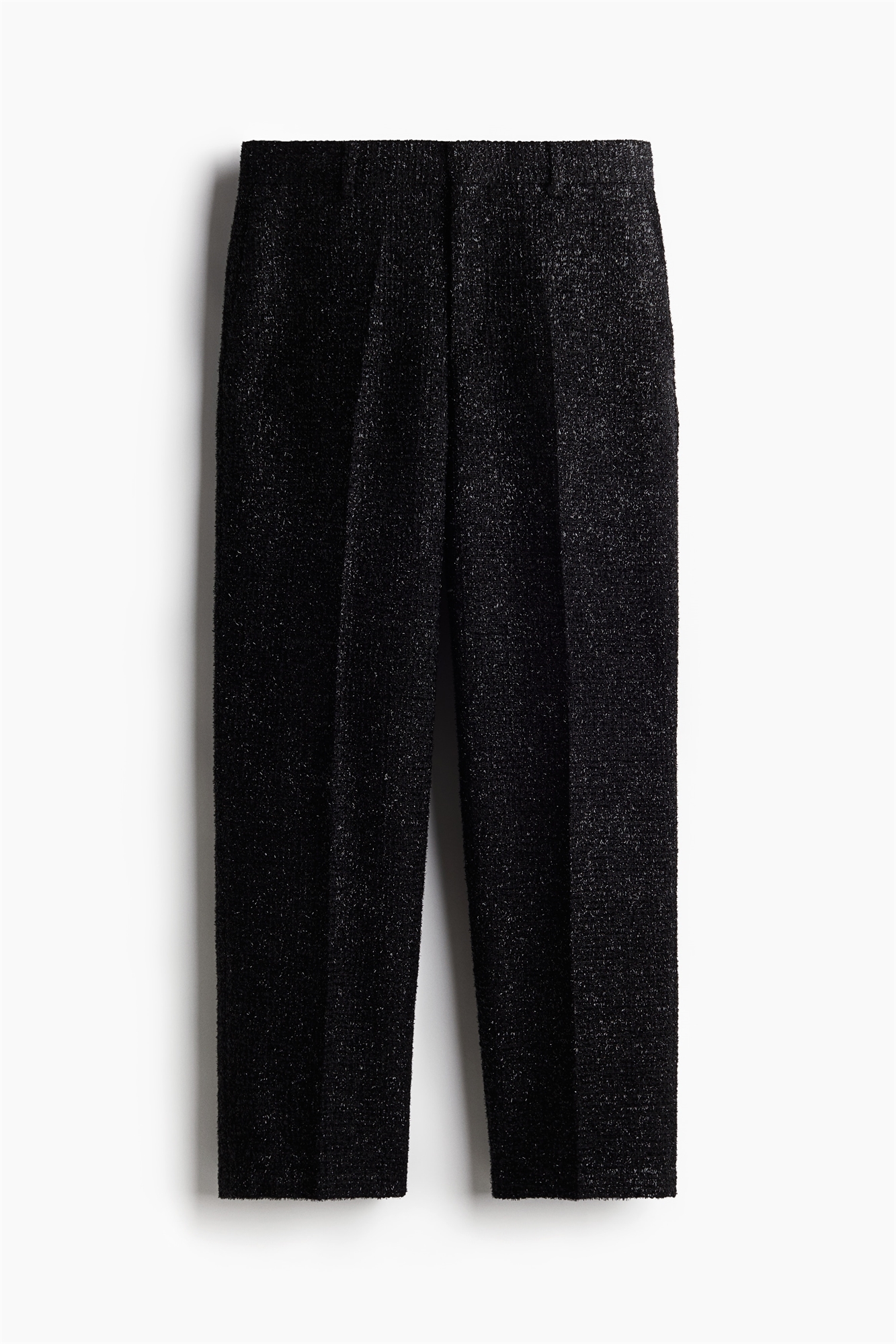Брюки из жаккардового переплетения с блестящими нитями. Ширинка на молнии со скрытой пуговицей и застежкой на крючок, диагональные боковые карманы и втачные задние карманы. Прямые ноги со складками спереди и сзади. Свободный крой для непринужденного, но не чрезмерного силуэта.