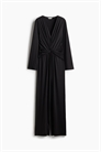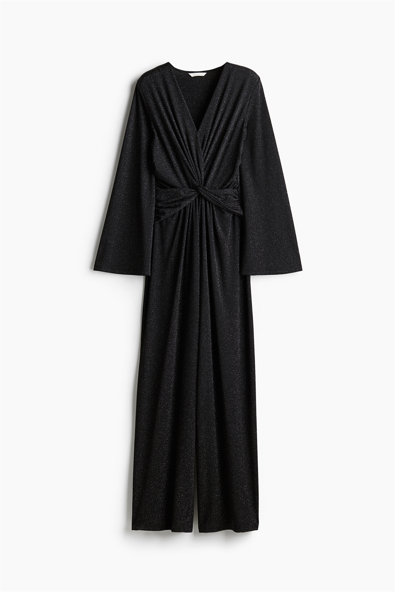 Джемпер из джерси с глубоким V-образным вырезом, потайной застежкой-крючком и деталью в виде узла на талии для драпировки. Длинные рукава и прямые ноги.