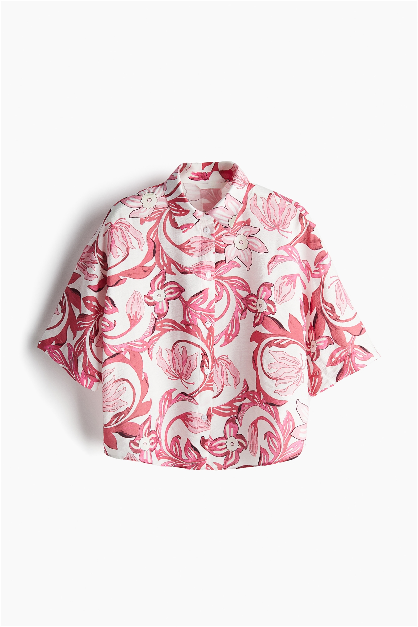 Свободная рубашка из тканого материала с воротником, пуговицами спереди и перевернутой складкой сзади. Спущенные плечи и рукава длиной до локтя.
