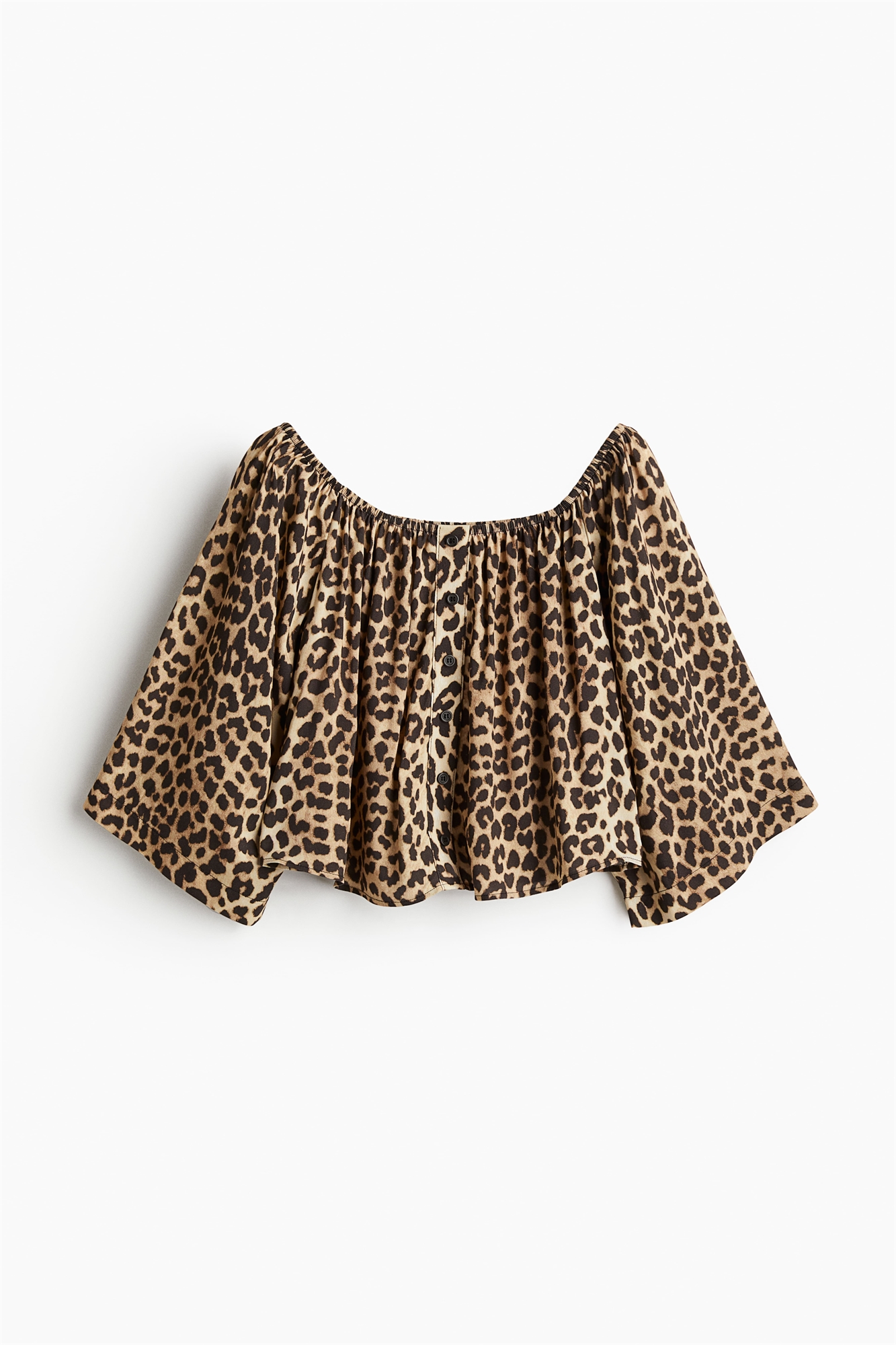 Свободная блузка без плеч из вискозного полотна с эластичной отделкой в верхней части, декоративными пуговицами спереди и расклешенными рукавами длиной 3/4.