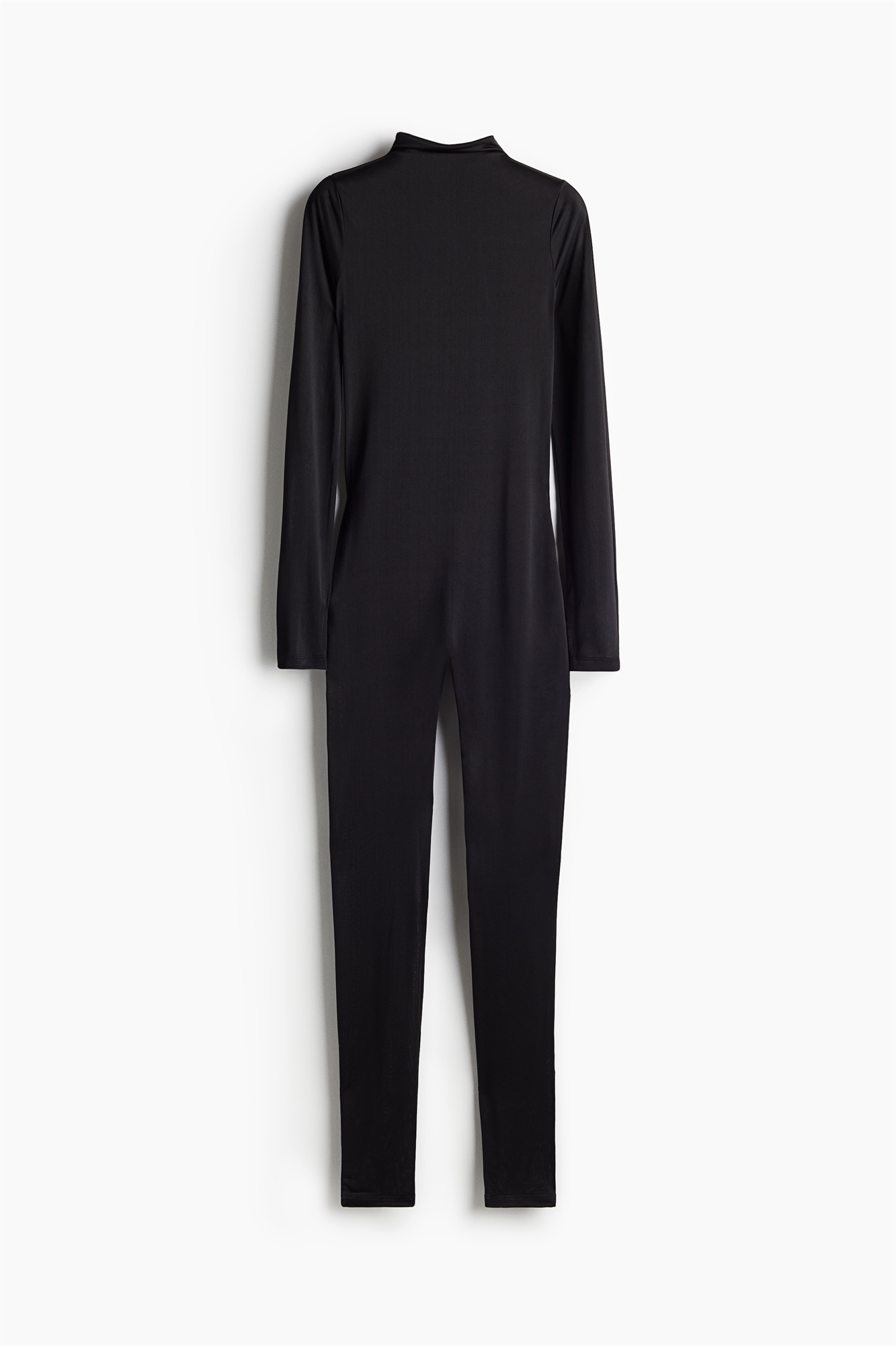 Однотонная модель из джерси с водолазкой и длинными рукавами с отверстиями для больших пальцев. Потайная застежка-молния сзади.