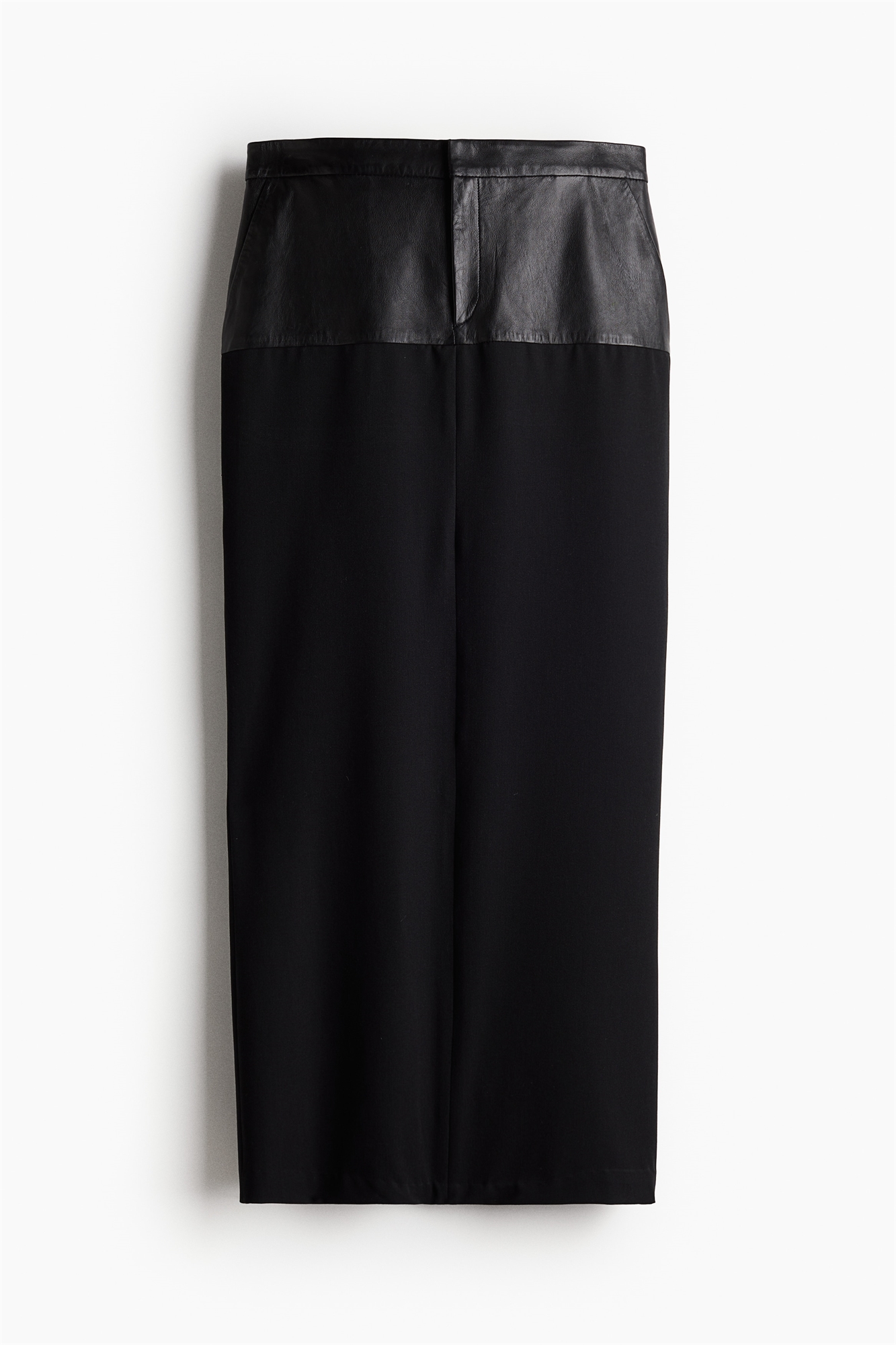 Коллекция Studio. Юбка в пол с верхней частью из мягкой кожи и нижней частью из саржи из смеси вискозы. Регулярная талия, ширинка на молнии и потайные застежки-крючки. Диагональные боковые карманы, накладной задний карман и высокий разрез сзади. Короткая внутренняя юбка из вискозной саржи.