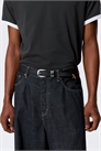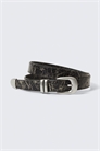 Актуальный ремень из искусственной кожи, изготовленный из переработанного полиэстера. Он оснащен металлической пряжкой, пятью люверсами и металлическим наконечником.