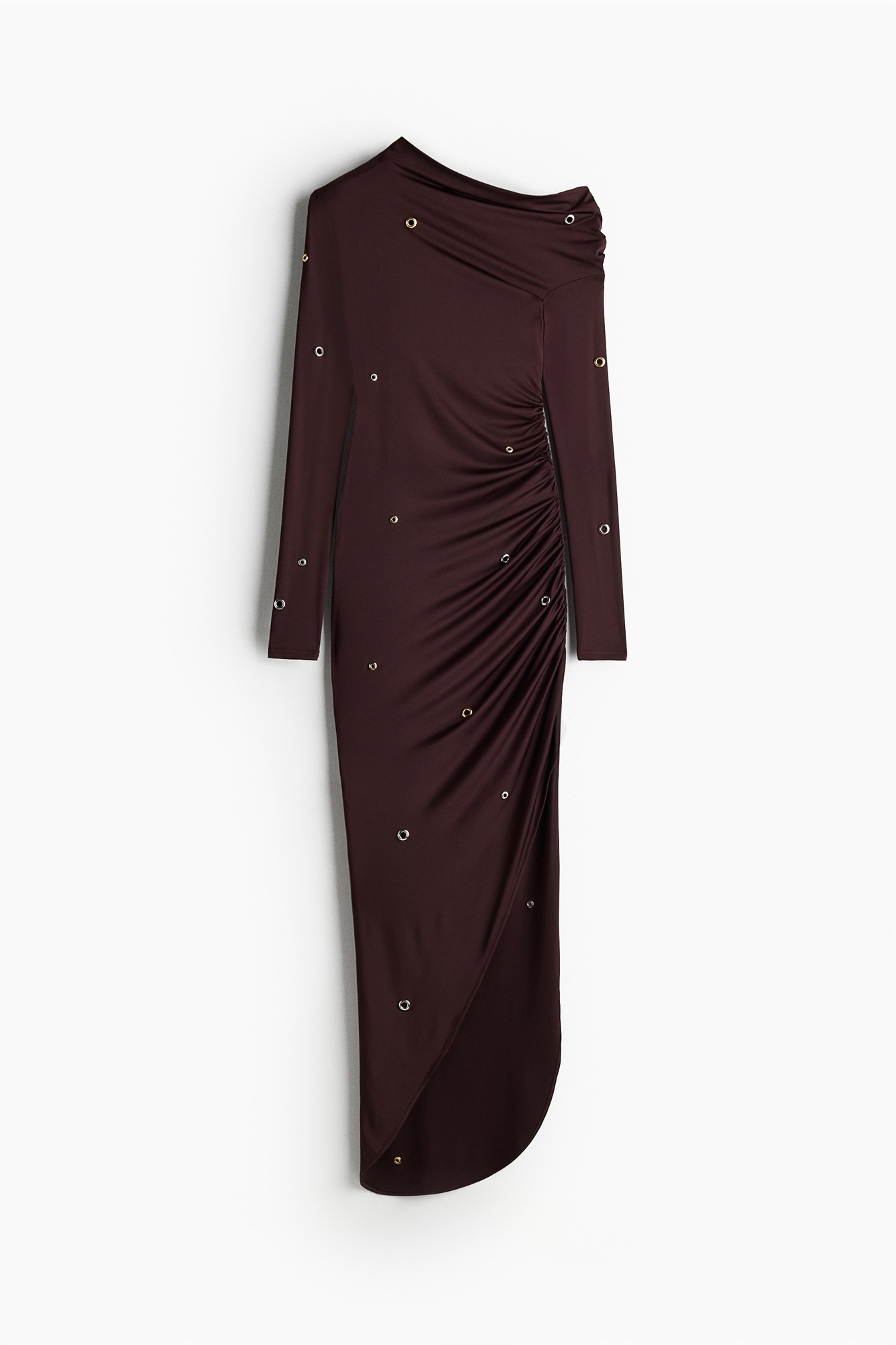 Коллекция Studio. Облегающее платье длиной до щиколоток из эластичного трикотажа с легким блеском. Украшено металлическими люверсами золотого и серебряного цвета разных размеров, которые придают дизайну живой оттенок. Асимметричный вырез и подол, длинные рукава и сборки в одном боковом шве для эффекта драпировки.