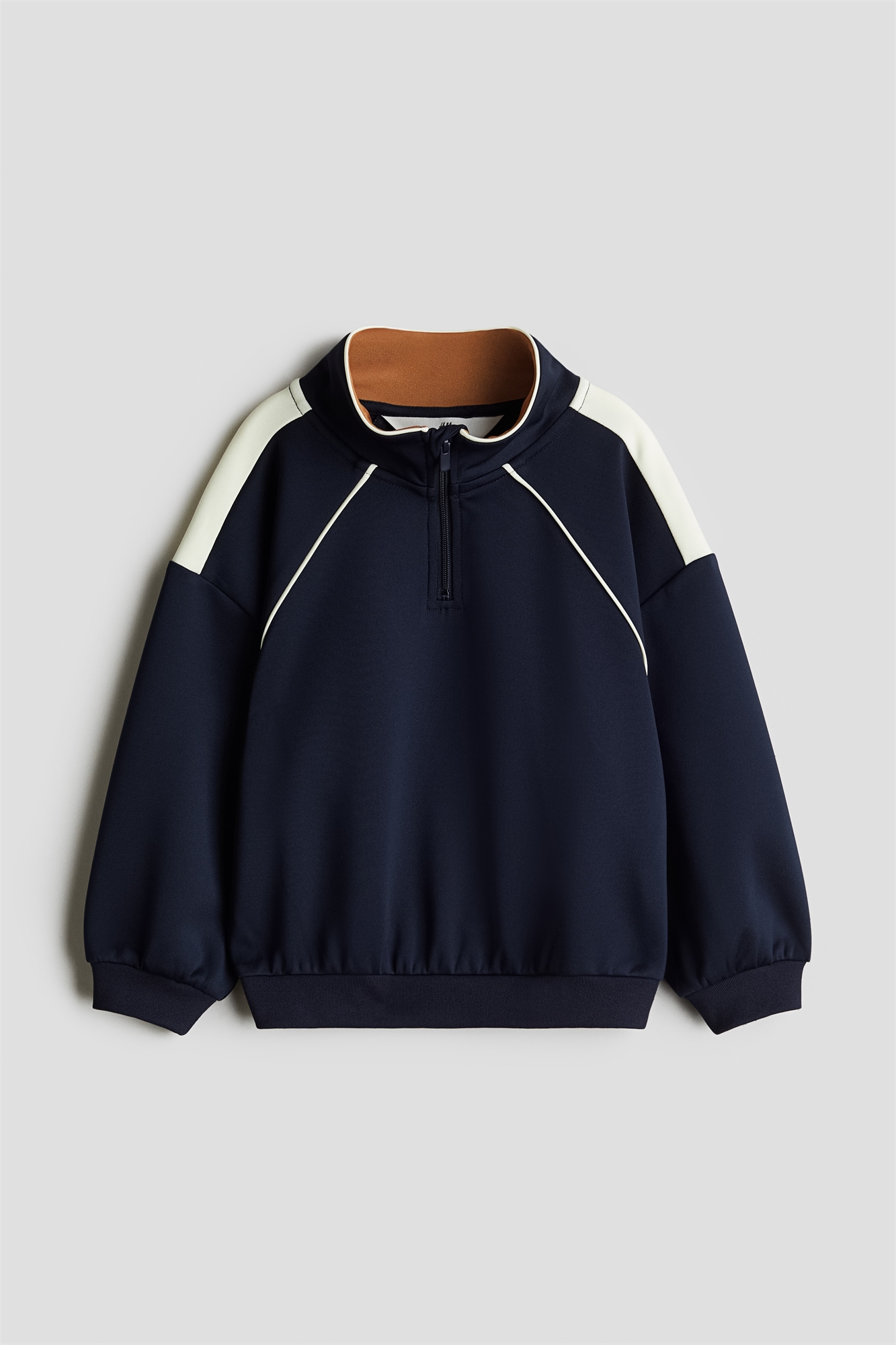 Спортивная куртка из джерси с начесом внутри и легким блеском. Воротник-стойка, застежка-молния в верхней части с защитой подбородка от натирания, спущенные плечи и длинные рукава. Манжеты и подол в рубчик.