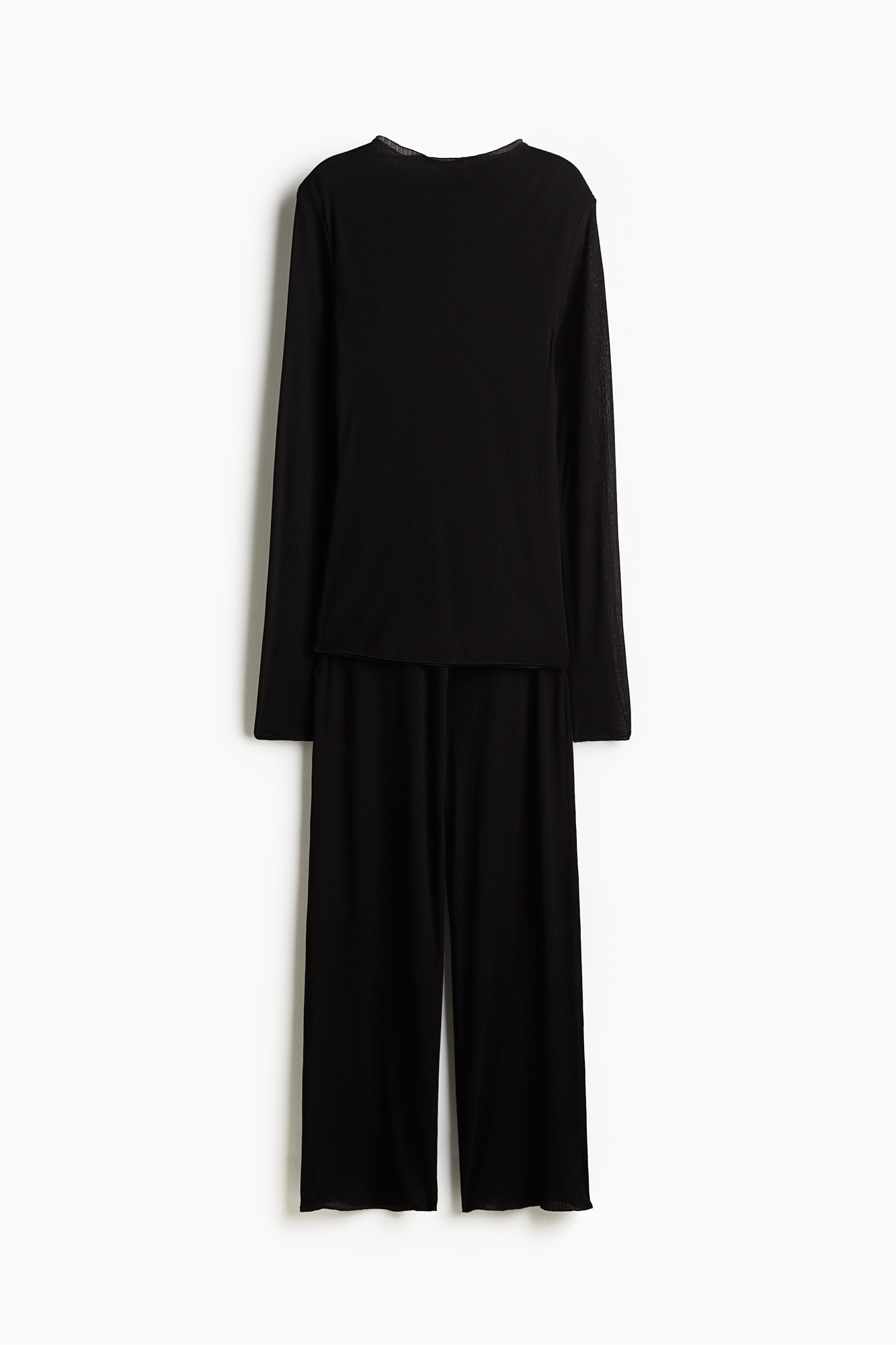 Пижама с верхом и низом из гладкого ребристого трикотажа с оверлочными краями. Слегка удлиненный верх с черепаховой горловиной и длинными рукавами. Низ с эластичной резинкой на талии.
