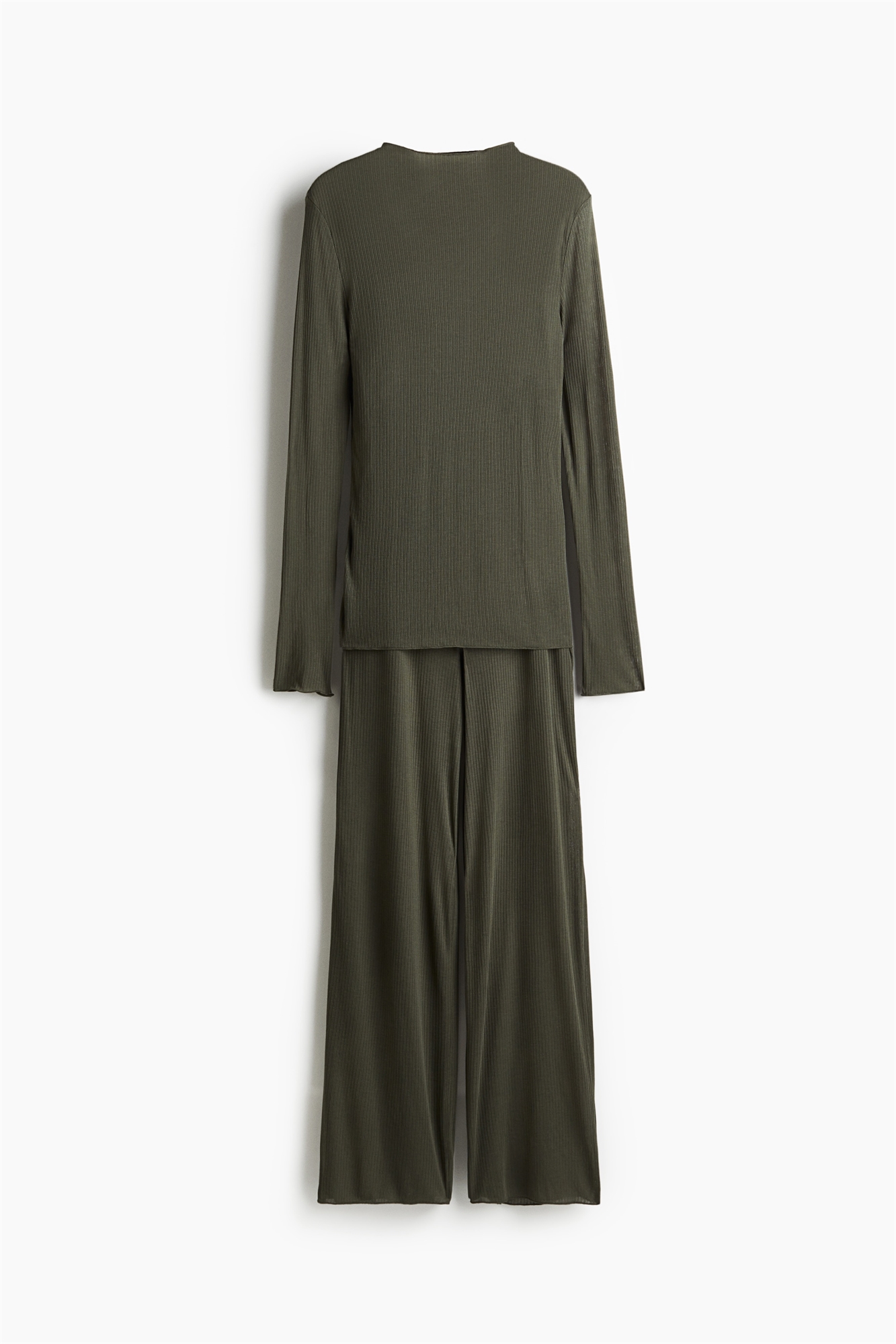 Пижама с верхом и низом из гладкого ребристого трикотажа с оверлочными краями. Слегка удлиненный верх с черепаховой горловиной и длинными рукавами. Низ с эластичной резинкой на талии.