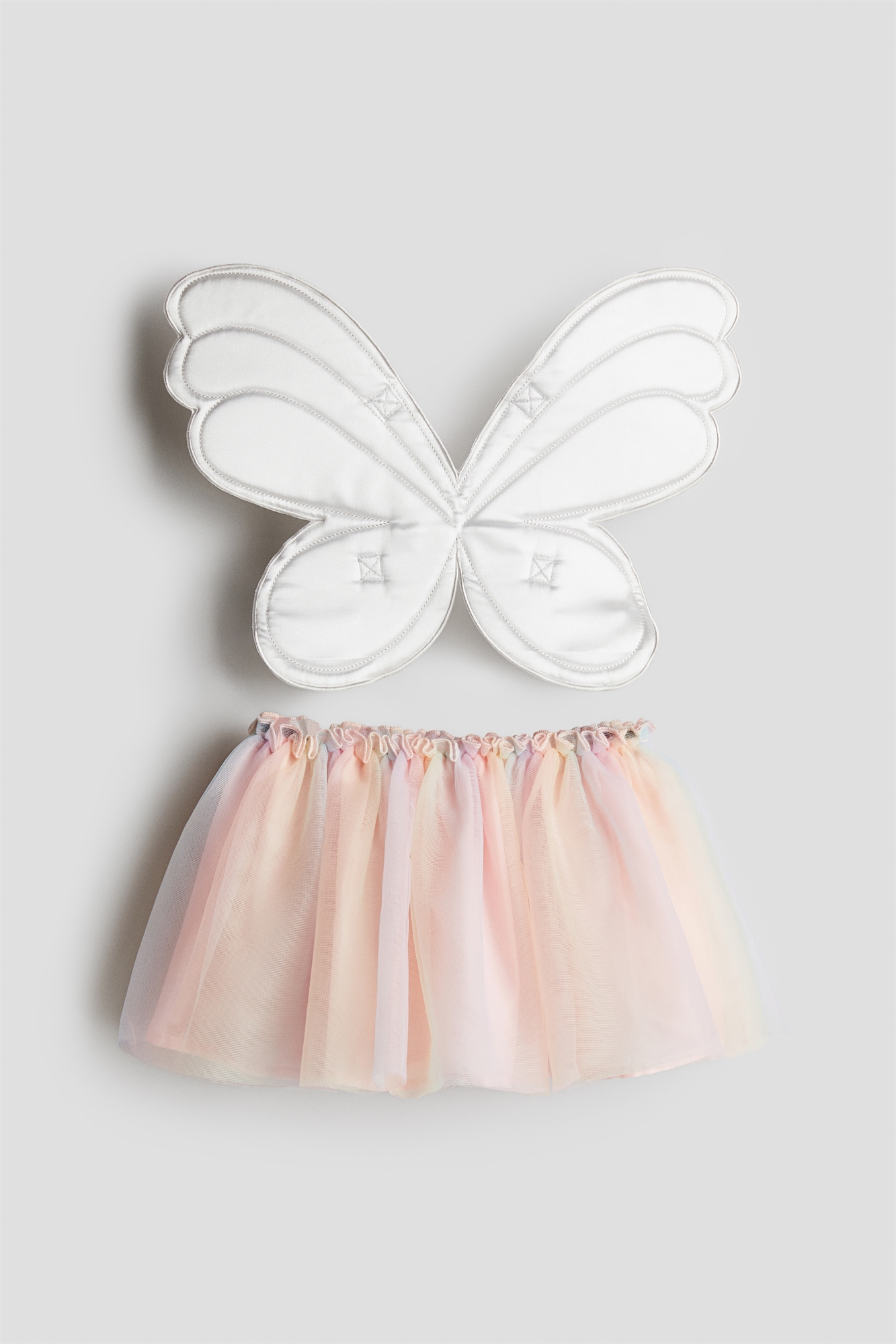 Комплект маскарадного костюма с юбкой и набивными атласными крыльями. Юбка на подкладке из двух слоев фатина с эластичной талией и оверлочной оборкой. Стеганые крылья с эластичными бретелями и застежкой на крючок и петлю.