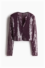Приталенный топ из пайеток с круглым вырезом, потайными застежками-крючками спереди и длинными рукавами. Частично на подкладке.